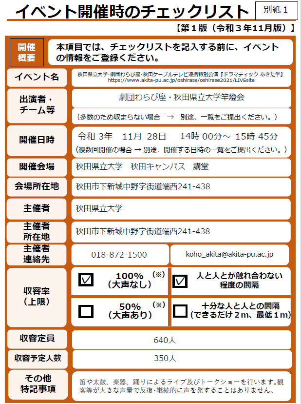 秋田県からの要請に基づき、本イベントに係る新型コロナウイルス感染対策について、「感染防止策チェックリスト」により公表します。☆秋田県WEBページ「イベント・行事等の開催に当たっての感染防止策等について(11月25日付け)」にリンク