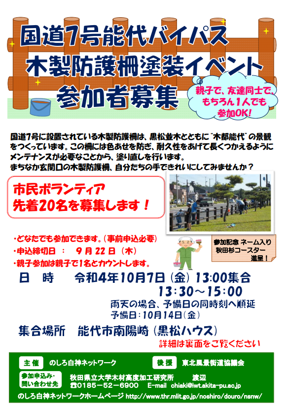 【参加者募集】国道7号能代バイパス木製防護柵塗装イベント