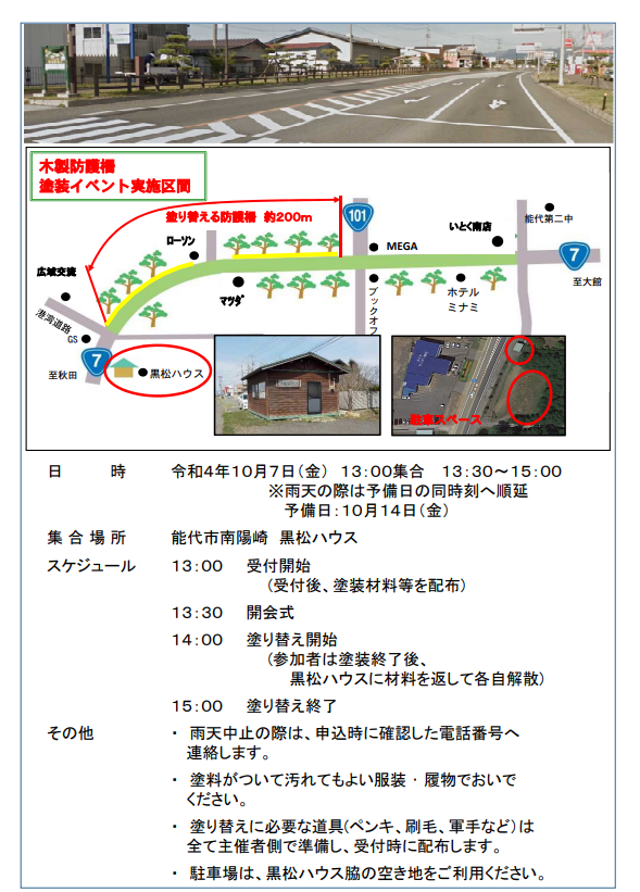 本イベントは、乱横断防止のために国道7号能代バイパスに設置されている木製防護柵の耐久性向上とお色直しによる景観美化を目的として、平成29年度から一般市民のボランティアを募って行われているイベントです。