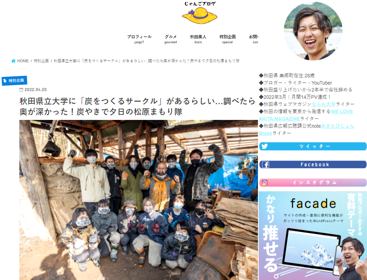 秋田の人気ブロガーじゃんごさんの「じゃんごブログ」で、 炭やきで夕日の松原まもり隊の地域活動、建築環境システム学科 田村成さんの研究が紹介されましたので、是非、ご覧ください‼ じゃんごさんありがとうございます!※「じゃんご」とは秋田弁で「田舎」を意味します