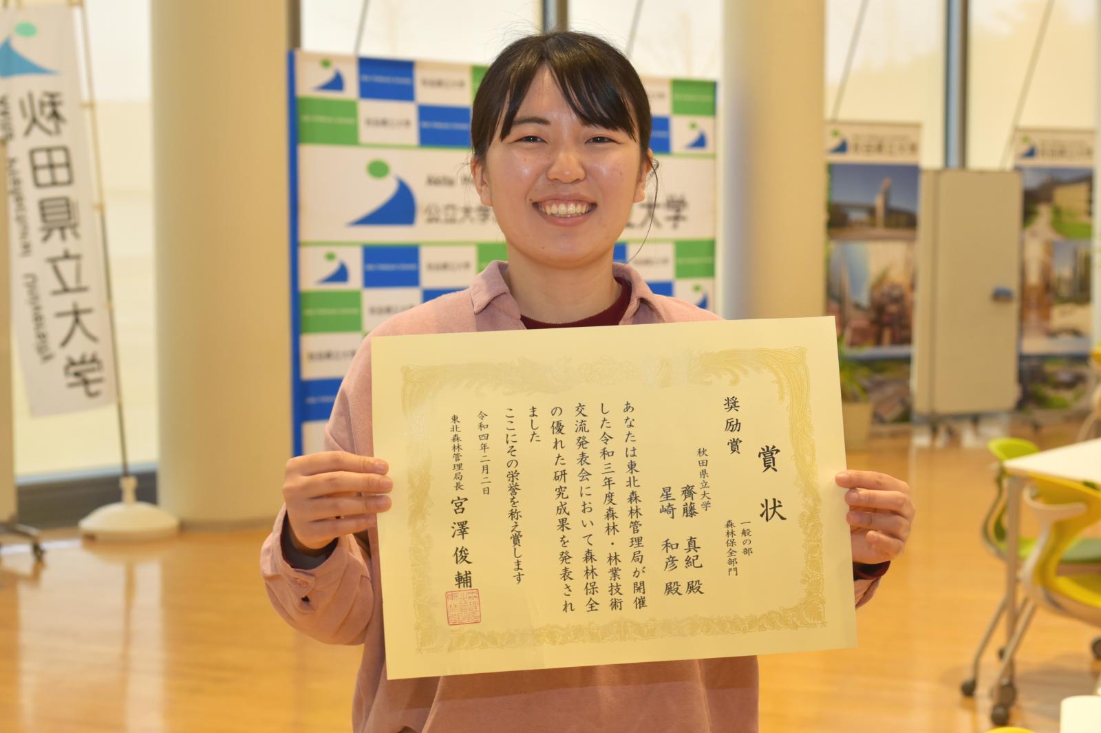 令和4年2月1日(火)~2日(水)にオンライン形式で開催された「森林・林業技術交流発表会」において、大学院・生物資源科学研究科(博士前期課程2年)の齊藤真紀さん(森林科学研究室)が、森林保全部門で奨励賞を受賞しました。齊藤さんは、森林科学研究室の強固なチームワークと、指導教員の星崎 和彦 教授の親身かつ丁寧な研究指導の下、コツコツ研究を継続して取り組んだ結果、本賞の受賞に繋がりました。