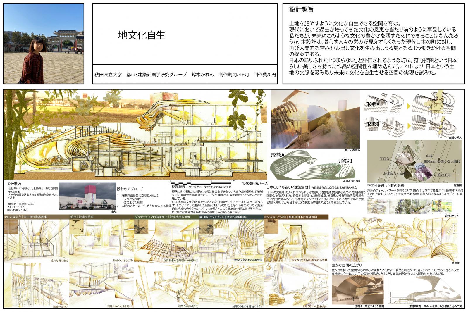 この作品は、卒業制作で取り組んだものであり、日本文化について自分なりに考えを深め、悩みながらも形に落とし込み、建築物として仕上げた作品です。紙や粘土によるスタディから導いた曲面がグラフィックソフトにはない“あたたかさ”を感じる点などが評価されました。