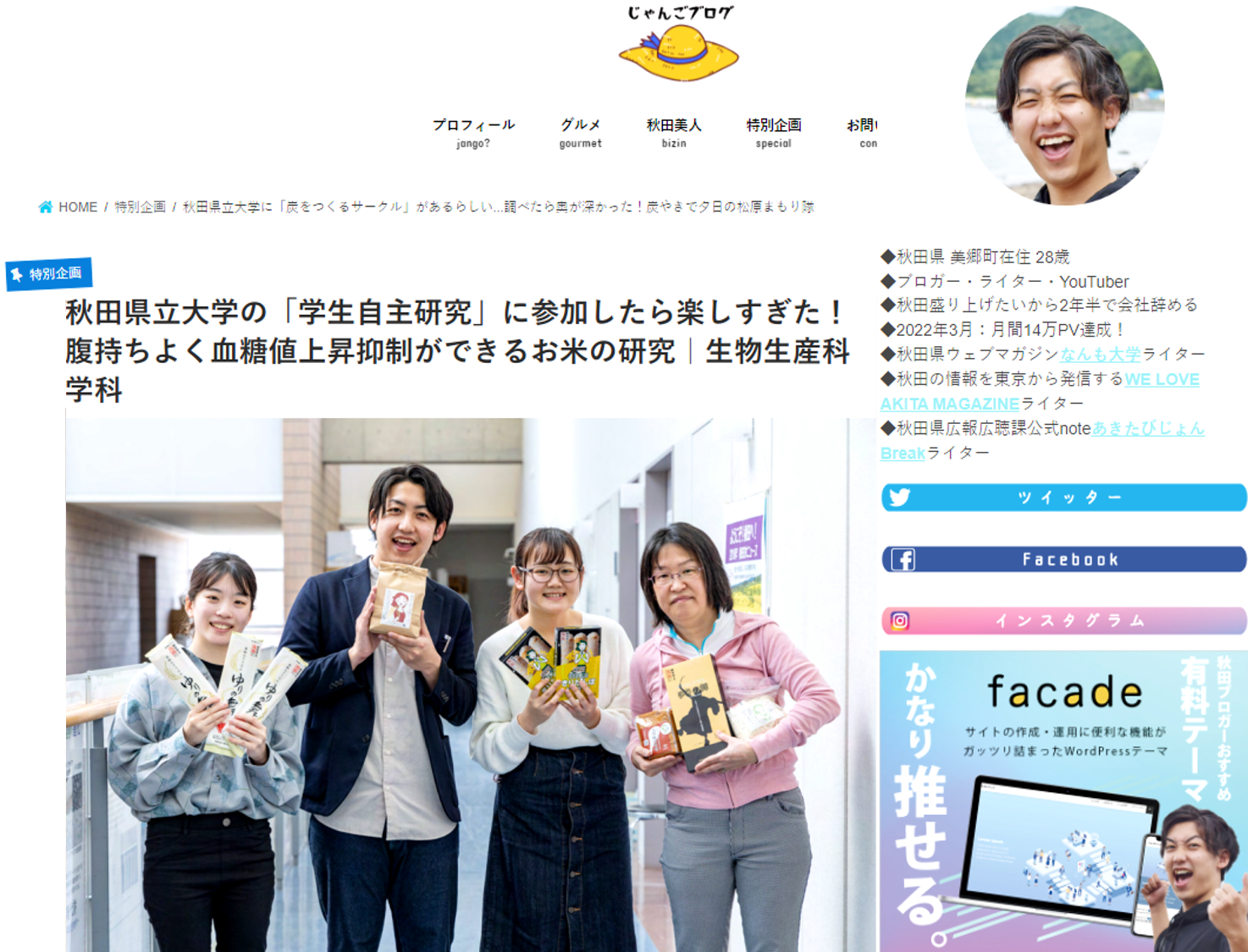 秋田の人気ブロガーじゃんごさんの「じゃんごブログ」で、 生物生産科学科の学生自主研究「まんぷくすらりの美味しい食べ方」(指導教員:藤田 直子 教授)が紹介されましたので、是非、ご覧ください‼ じゃんごさんありがとうございます!※「じゃんご」とは秋田弁で「田舎」を意味します