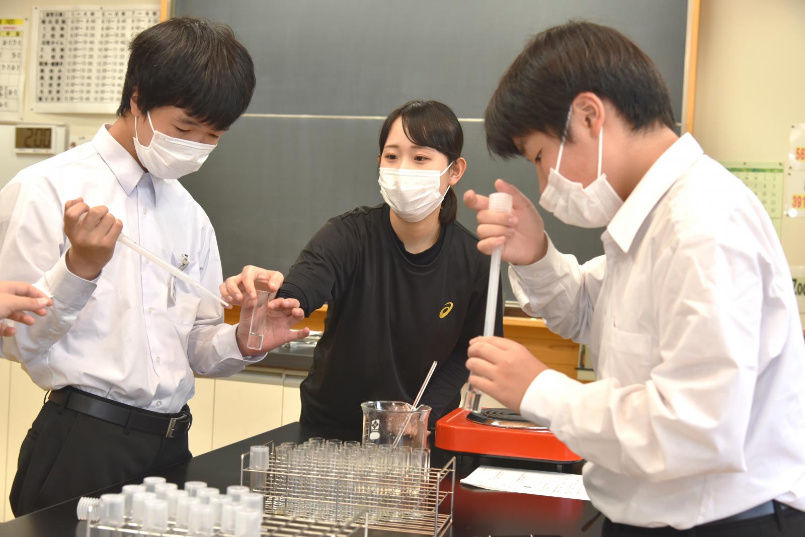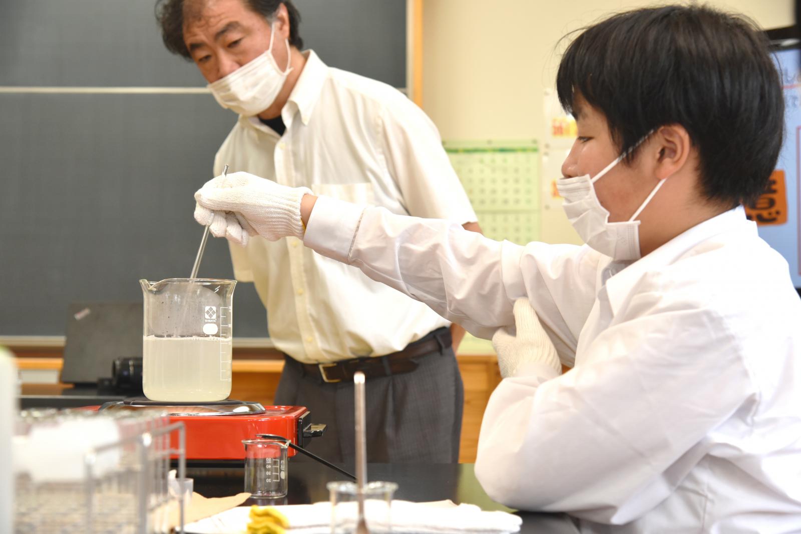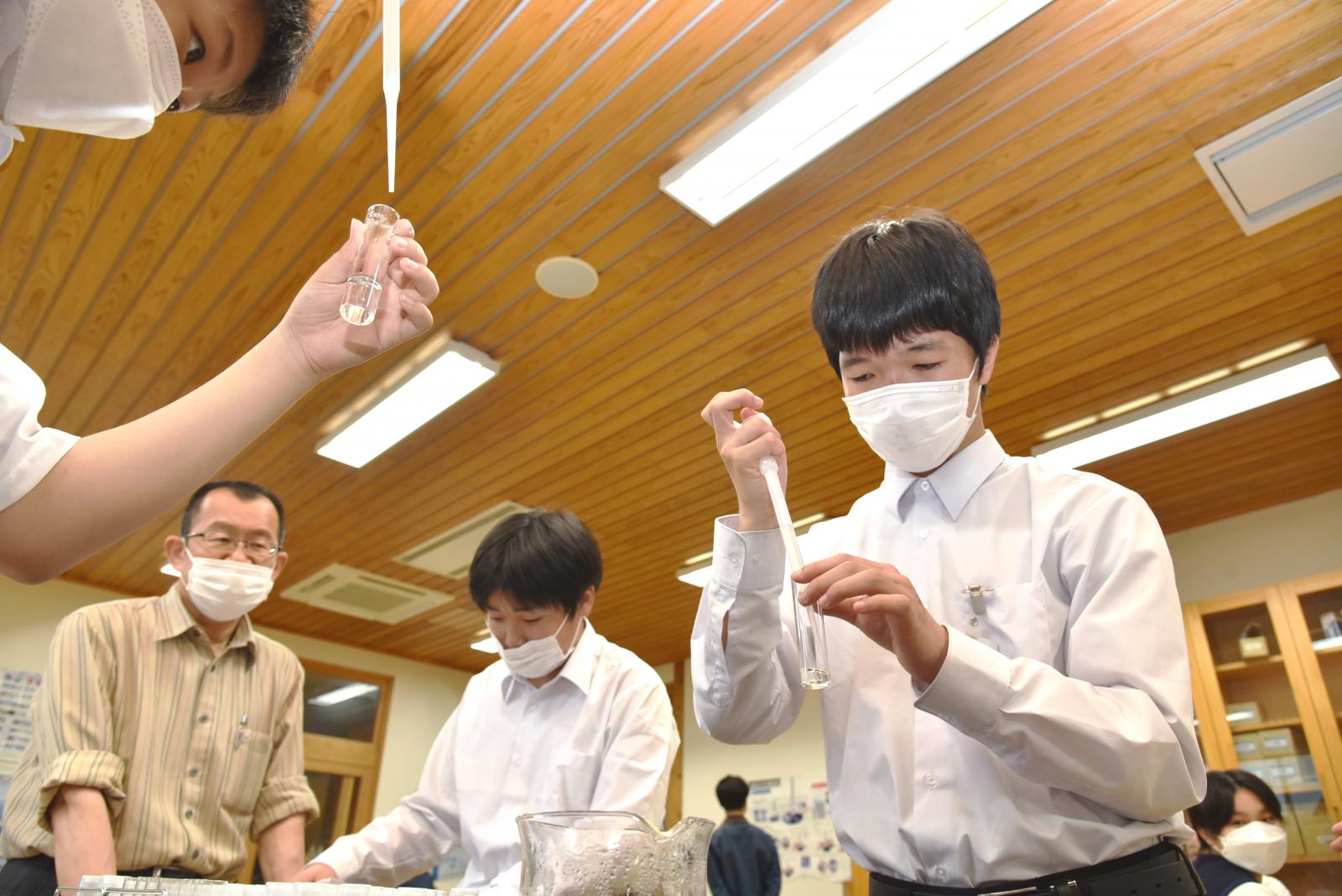 1日目の28日(火)は、細胞などの培養に使う栄養分を含んだ液体を寒天で固めた「寒天培地」作りを体験しました。培地は、植物や微生物が育つために必要な栄養が詰まった液体のことで、今回は、蒸留水に砂糖を混ぜ沸騰させ寒天を加え、冷ましたものを少しずつ試験管に入れ培地を作りました。科学実験のような栽培方法に、生徒たちは最初は不安な様子でしたが、県大生や地元生産者のサポートを得ながら、手際よく作業を進めました。