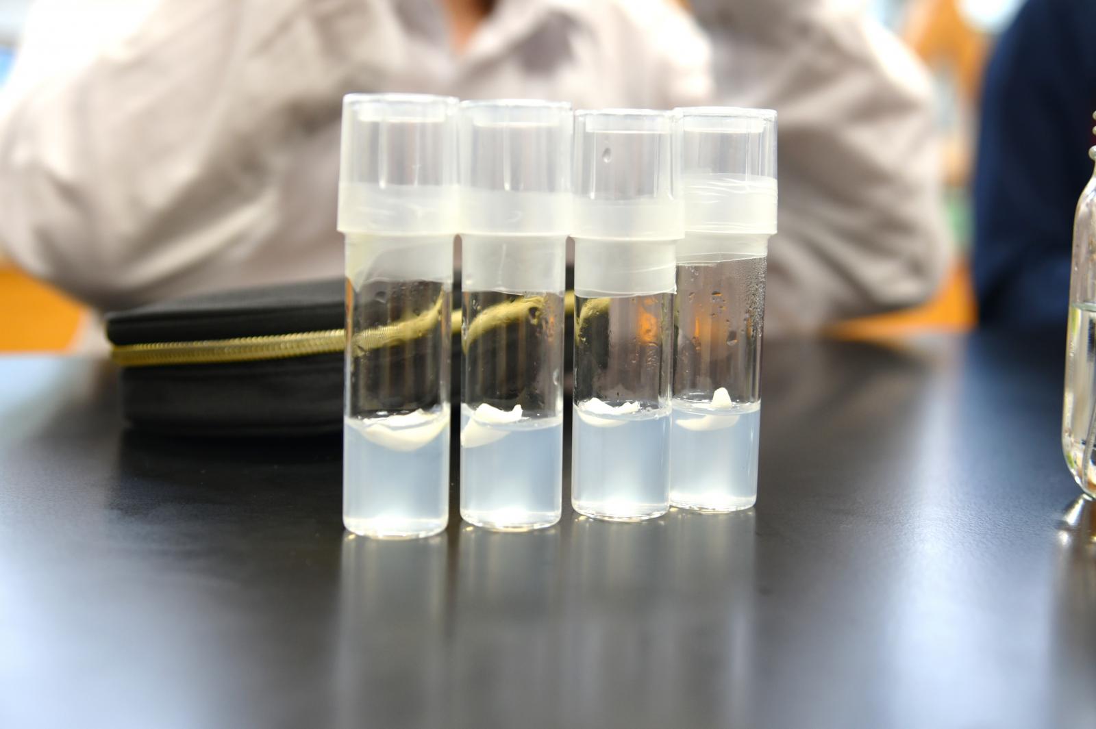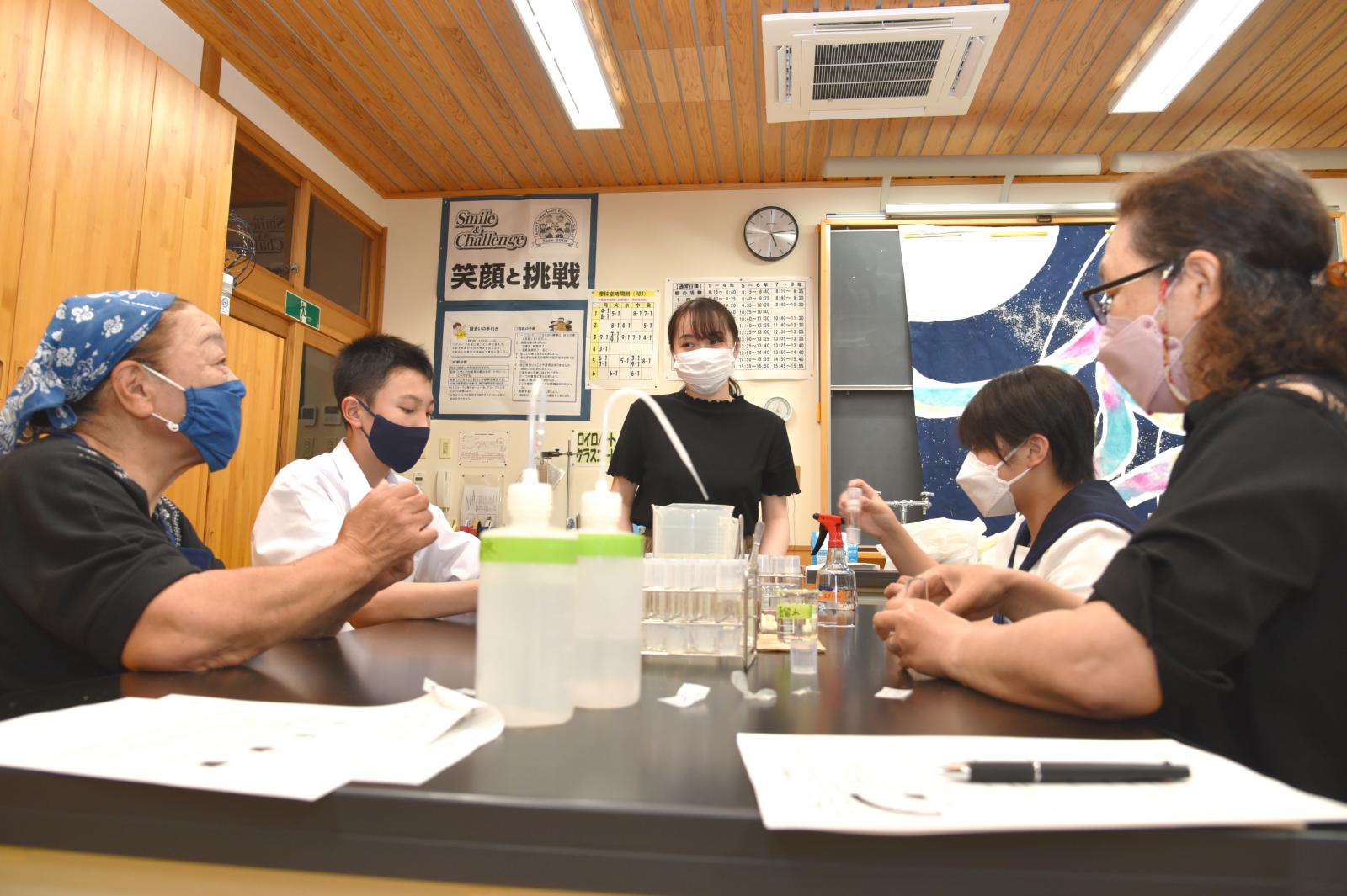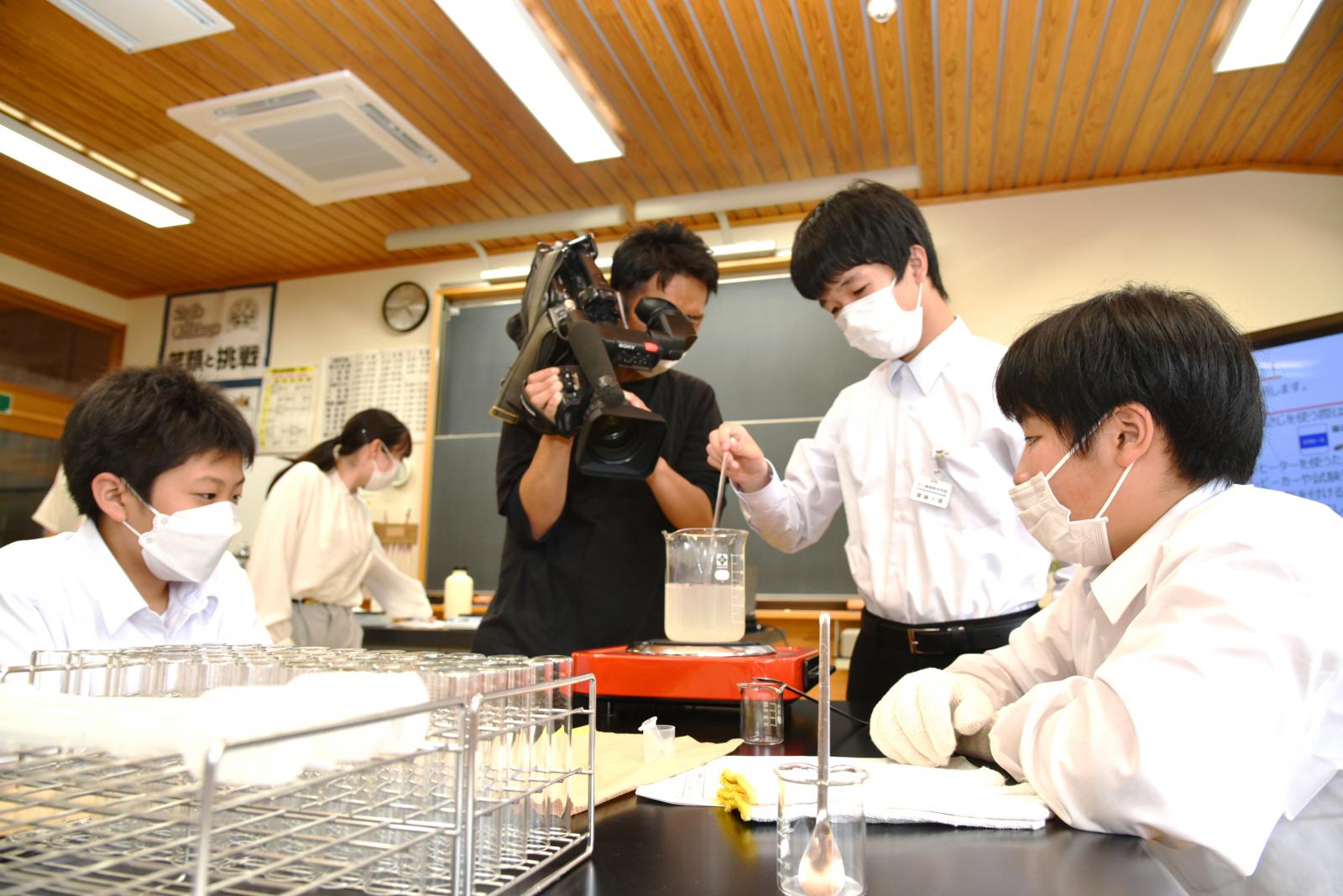 1日目の28日(火)は、細胞などの培養に使う栄養分を含んだ液体を寒天で固めた「寒天培地」作りを体験しました。培地は、植物や微生物が育つために必要な栄養が詰まった液体のことで、今回は、蒸留水に砂糖を混ぜ沸騰させ寒天を加え、冷ましたものを少しずつ試験管に入れ培地を作りました。科学実験のような栽培方法に、生徒たちは最初は不安な様子でしたが、県大生や地元生産者のサポートを得ながら、手際よく作業を進めました。