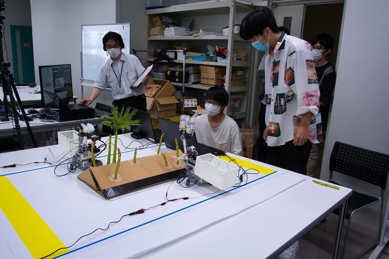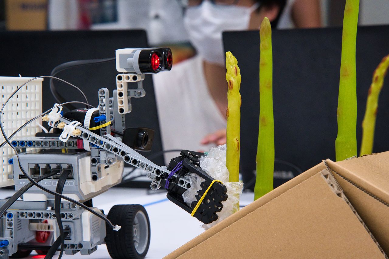 昨年、一昨年とコロナ禍のためバーチャル空間でのみの競技となりましたが、今年度は初めて実際に1/2縮尺のアスパラガス畝を再現し、実物のロボットを作製して、競技会を実施することができました。バーチャルではロボットに触れないという大変さがありましたが、実機は環境の影響を受けやすいという違った大変さがあり、学生も知恵を尽くして何とかアスパラガスを収穫していました。学生の皆さん、大変お疲れ様でした。