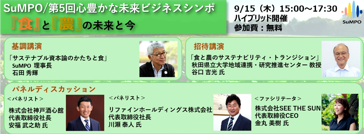 9月15日(木)、一般社団法人サステナブル経営推進機構が主催する「第5回心豊かな未来ビジネスシンポジウム」において、本学生物資源科学部生物環境科学科の谷口 吉光教授(地域連携・研究推進センター、専門:環境社会学、食と農の社会学)が、『食と農のサステナビリティトランディション』と題して講演します。本シンポジウムは、「食と農の未来と今」というテーマで開催され、谷口教授は農業や食料システムのあるべき将来像への移行などについて講演します。ご興味ご関心のある方は、是非ご聴講ください。(参加無料・要参加申込)