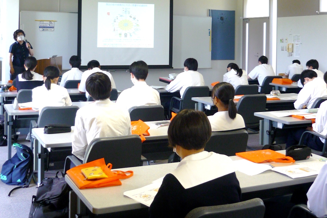 9月6日(火)秋田県立由利高等学校の2年生34名教員2名が秋田キャンパスを見学しました。これは、由利高校の生徒さんが、大学の学びや施設・設備を知り秋田県立大学への理解を深めると共に将来の進路に向け学習意欲を高める事を目的に実施されたものです。秋田県立大学についての説明を受けたあと、生物資源科学部 応用生物科学科の石川 匡子准教授の「食生活における塩の役割―おいしく減塩しよう」というテーマの模擬講義を受講しました。塩の役割は味付けだけではなく、加工や調理の過程で重要な役割があり、私たちの食生活に欠かせないのもだという事を学びました。生徒の皆さんは講義のメモをとり熱心に耳を傾けていました。
