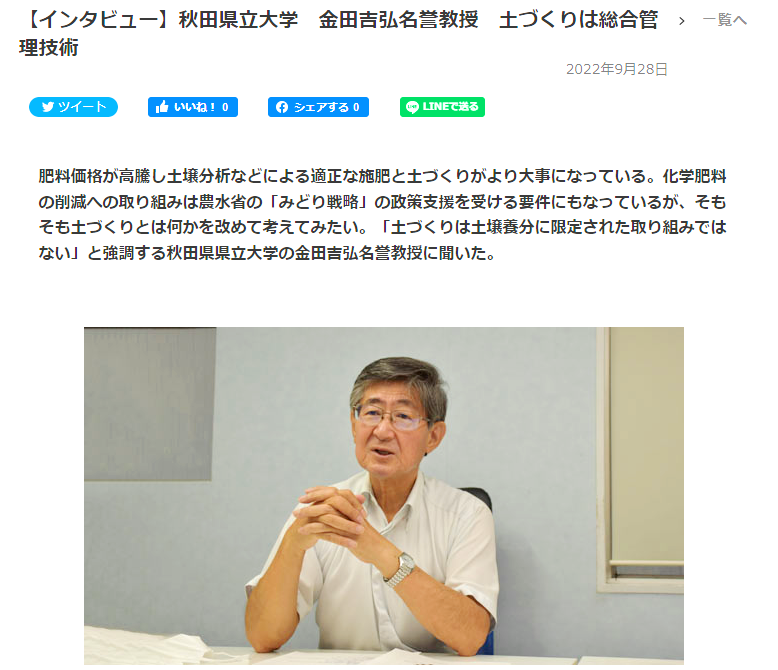 農業協同組合新聞に本学名誉教授のインタビューが掲載されました 農業・農協の専門ニュースサイト「農業協同組合新聞電子版・JAcom(9月28日号)」に、金田 吉弘 名誉教授(前生物資源科学部長。生物環境科学科土壌環境学研究室)のインタビューが掲載されました。 『土づくりは総合管理技術』秋田県立大学 金田 吉弘 名誉教授(外部リンク)