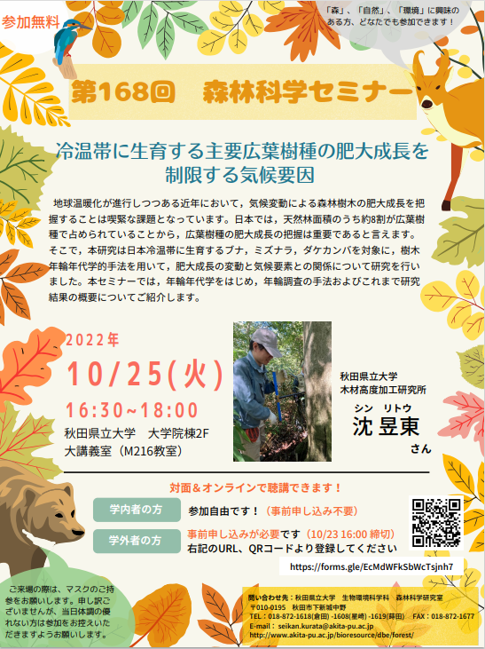 本学生物資源科学部(生物環境科学科/森林科学研究室)では、以下のとおり「第168回森林科学セミナー」を開催しますので、ご興味・ご関心のある方は、是非ご参加ください。☆日 時 10月25日(火)16:30ー18:00