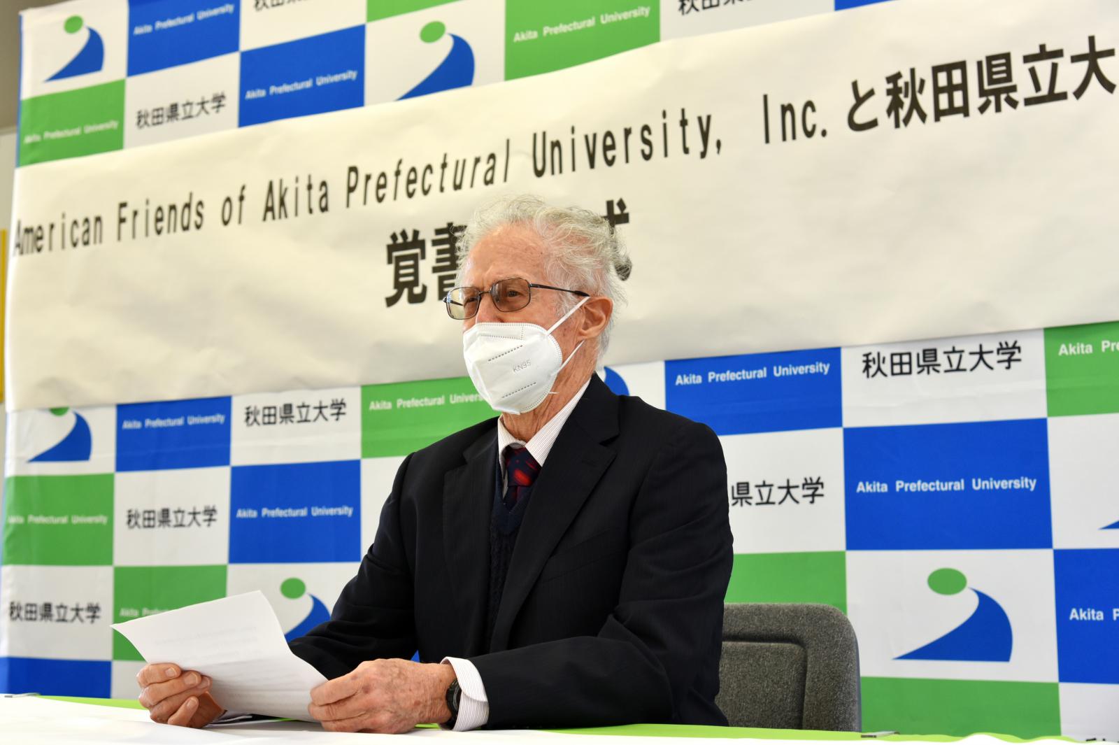 この「John Caldwell Legacy Project」推進のための資金の提供は、博士のご子息ポール・コールドウェル氏からの寄附により、米国に設立された非営利団体「American friends of Akita Prefectural University, Inc.」を通じて行われることとなっており、当日は、代表のテリー・ウィルソン氏と、本学の小林淳一理事長が覚書へサインを取り交わし、ジョン・コールドウェル博士のほか、博士と共同研究等で長年の親交のある、佐藤 了本学名誉教授にもご臨席いただきました。