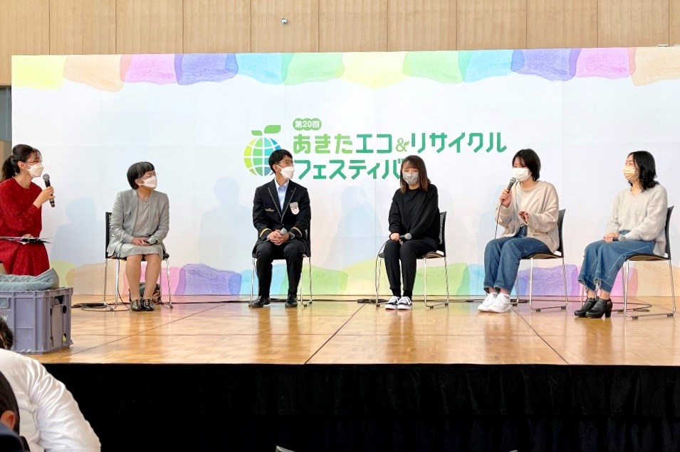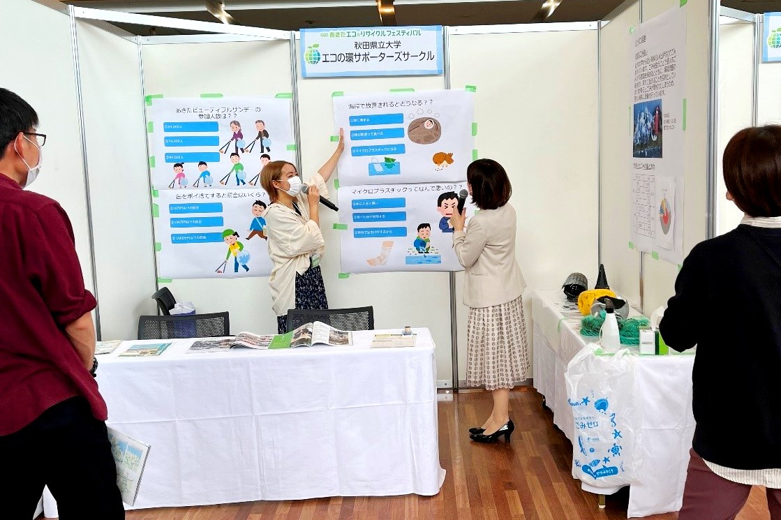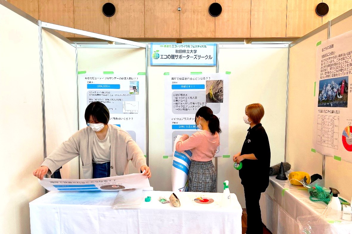10月8日(土)~9日(日)、秋田拠点センターアルヴェ1階きらめき広場にて、「第20回エコ&リサイクルフェスティバル」が開催され、「エコの環(わ)サポーターズサークル」が参加しました。今回は新型コロナの影響で3年ぶりの開催となり、例年より小規模で行われました。8日は秋田大学や国際教養大学の学生とともに社会人との討論会、9日は「海ゴミ問題」にテーマをフォーカスし、これまでサークルで行ってきた「海ゴミクリーンアップ活動」についてクイズを交えながら紹介しました。