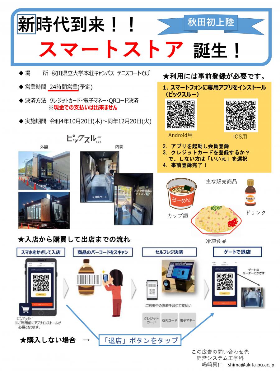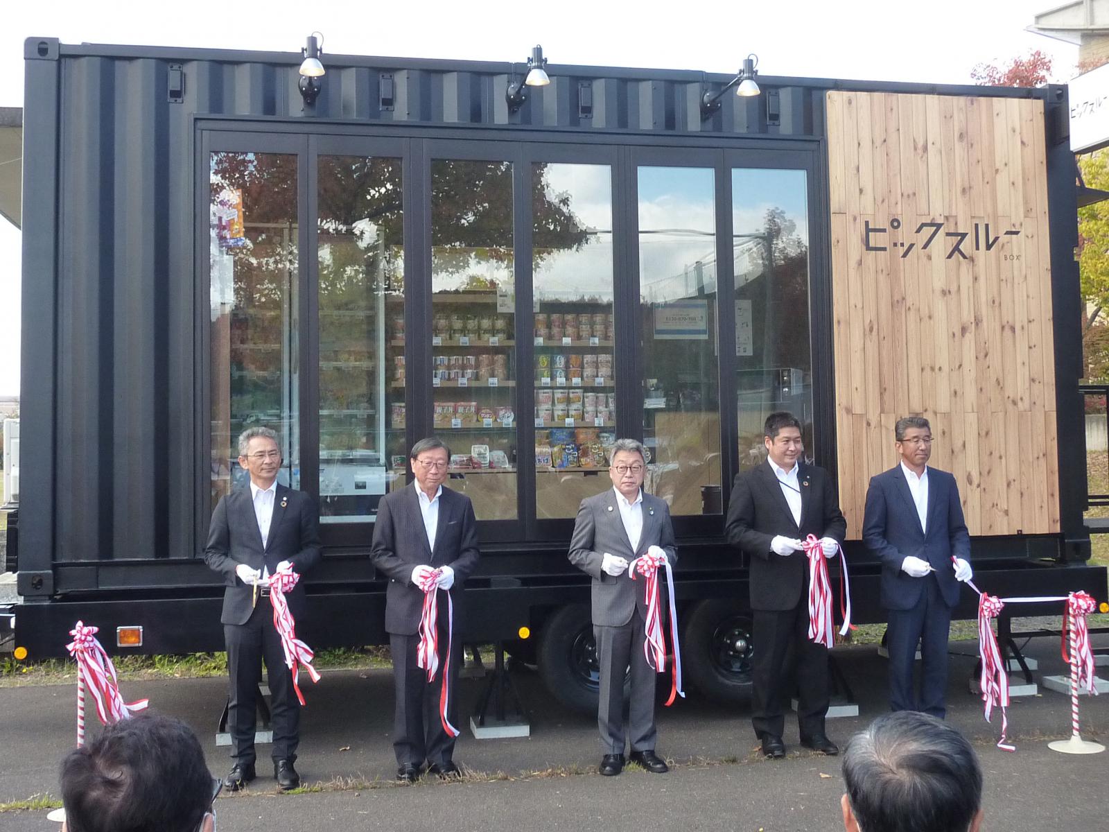10月20日(木)に、本学と由利本荘市、NTT東日本グループ、みちのくキヤンテイーンが共同して進めている、24時間営業の無人スマートストア「ピックスルー」が本荘キャンパスに設置され、開所式が執り行われました。スマートストアは入店から商品選択、セルフレジ決済、退店までを利用者自身のスマートフォンのみで完結し、店員が常駐しなくても営業できる店舗です。