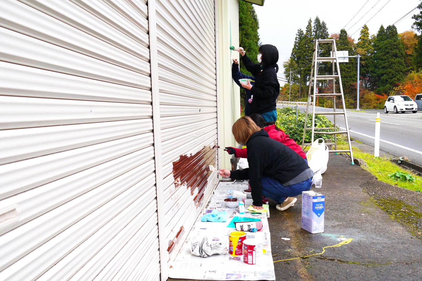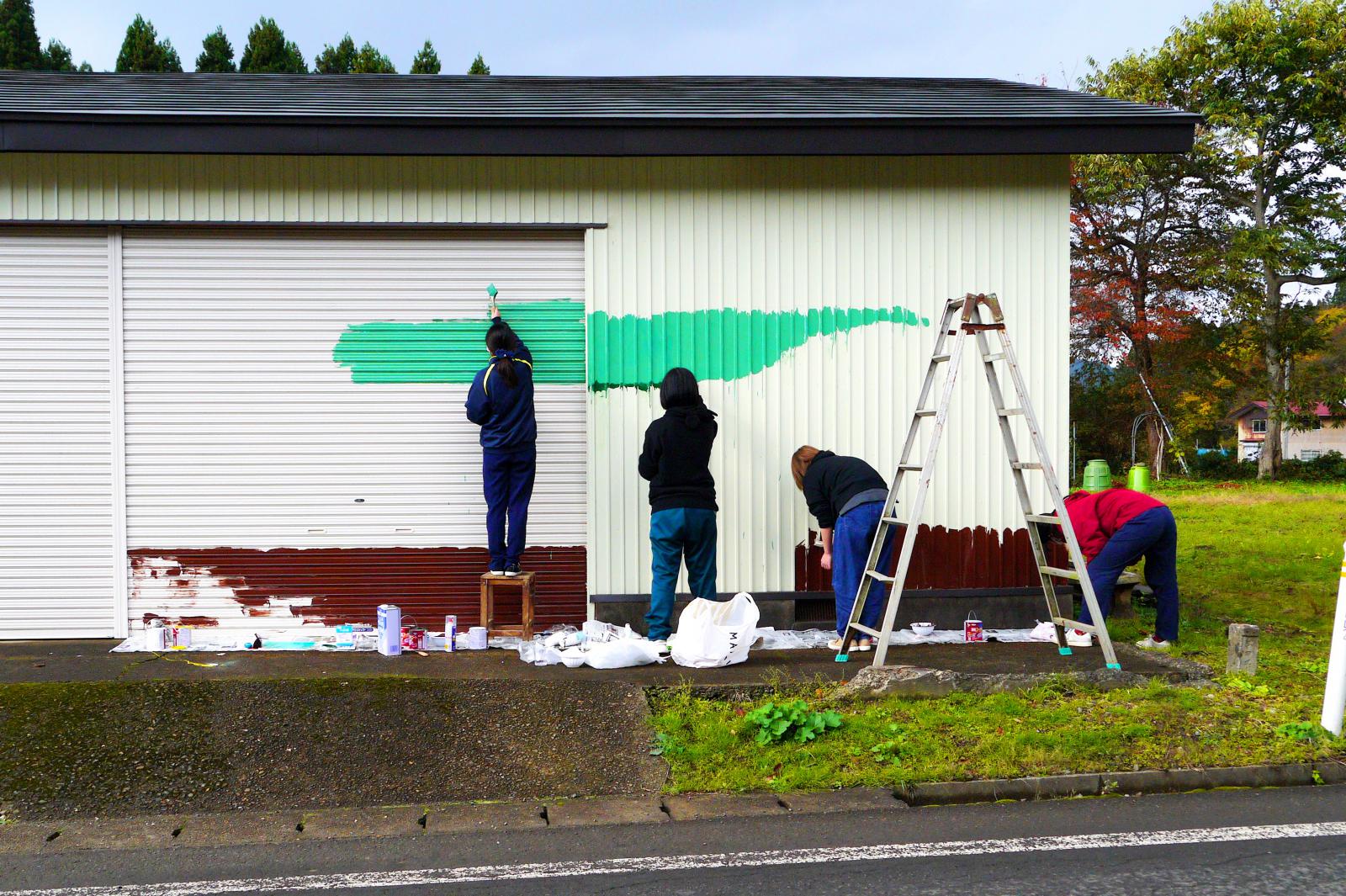 当日は午前中、時折雨が降るあいにくの天候で、塗ったペンキが予想以上に垂れたり、雨で作業が中断したりと作業が予想外に進みませんでしたが、「ゆう菜家」自慢の秋田の食材をふんだんに利用した手料理の数々を堪能した午後は、天候も回復し、メンバーが作業に慣れてきたこともあり順調に作業が進み、当初より2時間も早い午後3時過ぎに作業は完了しました。