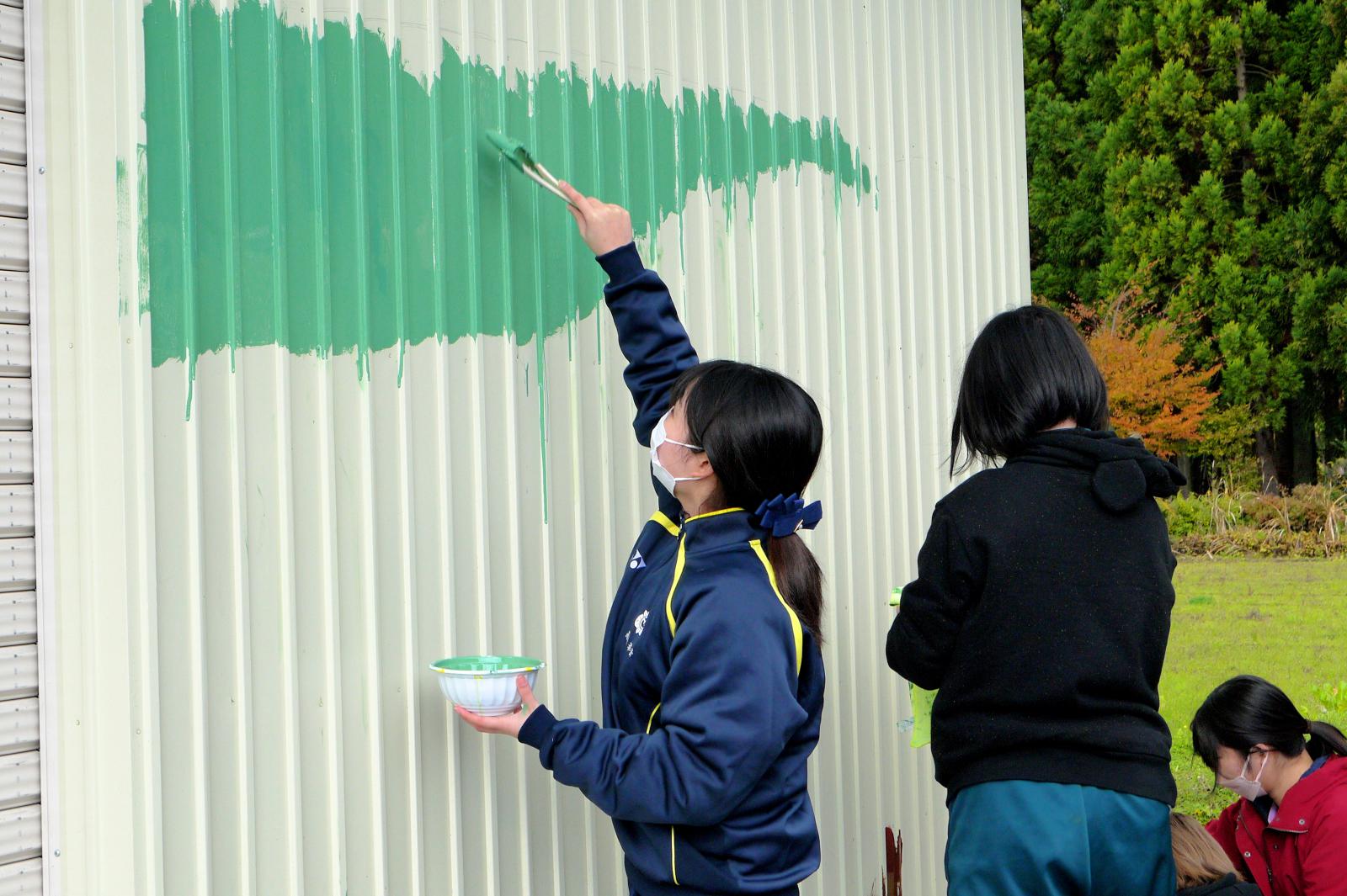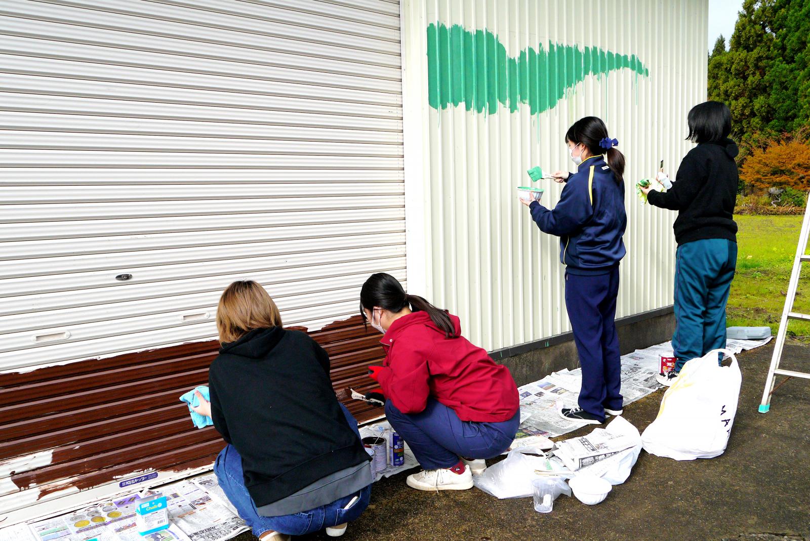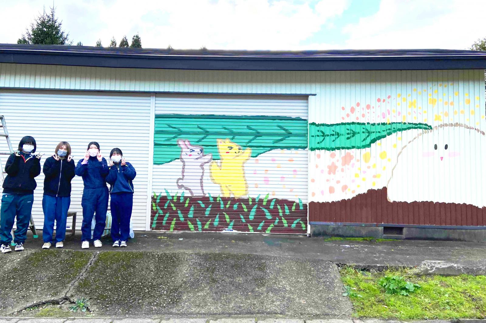 そんな折に、レストランの向かい側にある集落の農業機械倉庫の改修を行うこととなり、これを機に改修後の壁面に「ゆう菜家」のトレードマークであるカブをモチーフとした壁画を描いてもらえないか、という依頼が本学の文芸イラストサークルに寄せられました。
