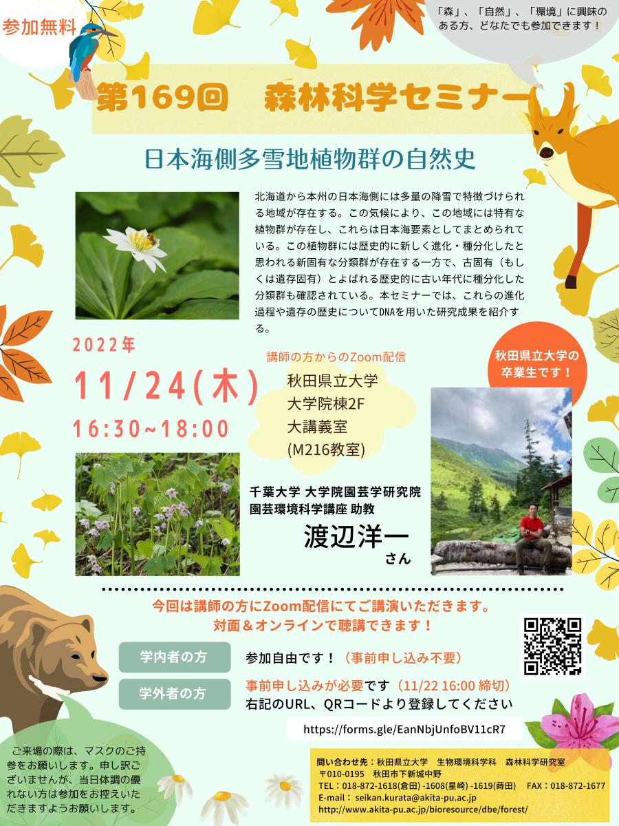 本学生物資源科学部(生物環境科学科/森林科学研究室)では、以下のとおり「第169回森林科学セミナー」を開催しますので、ご興味・ご関心のある方は、是非ご参加ください。☆日 時 11月24日(木)16:30~18:00
