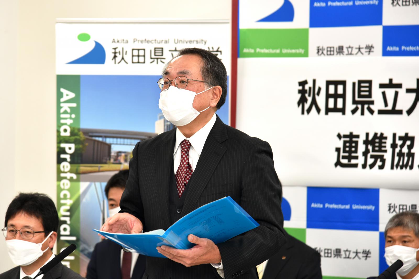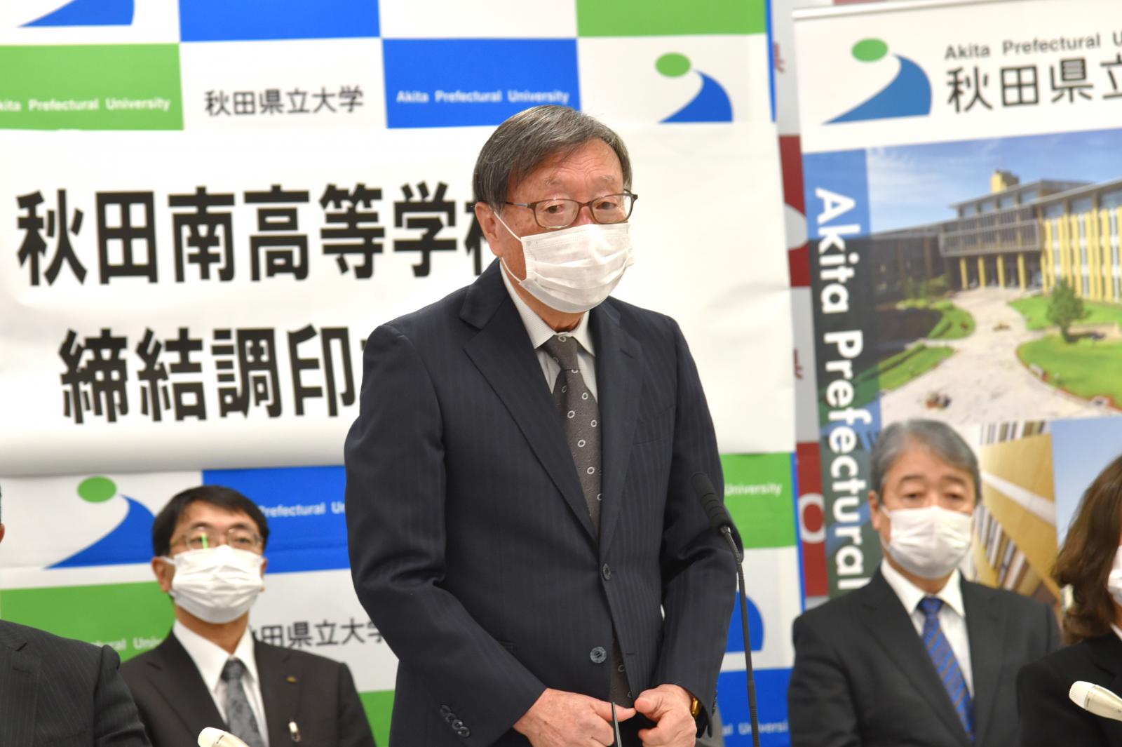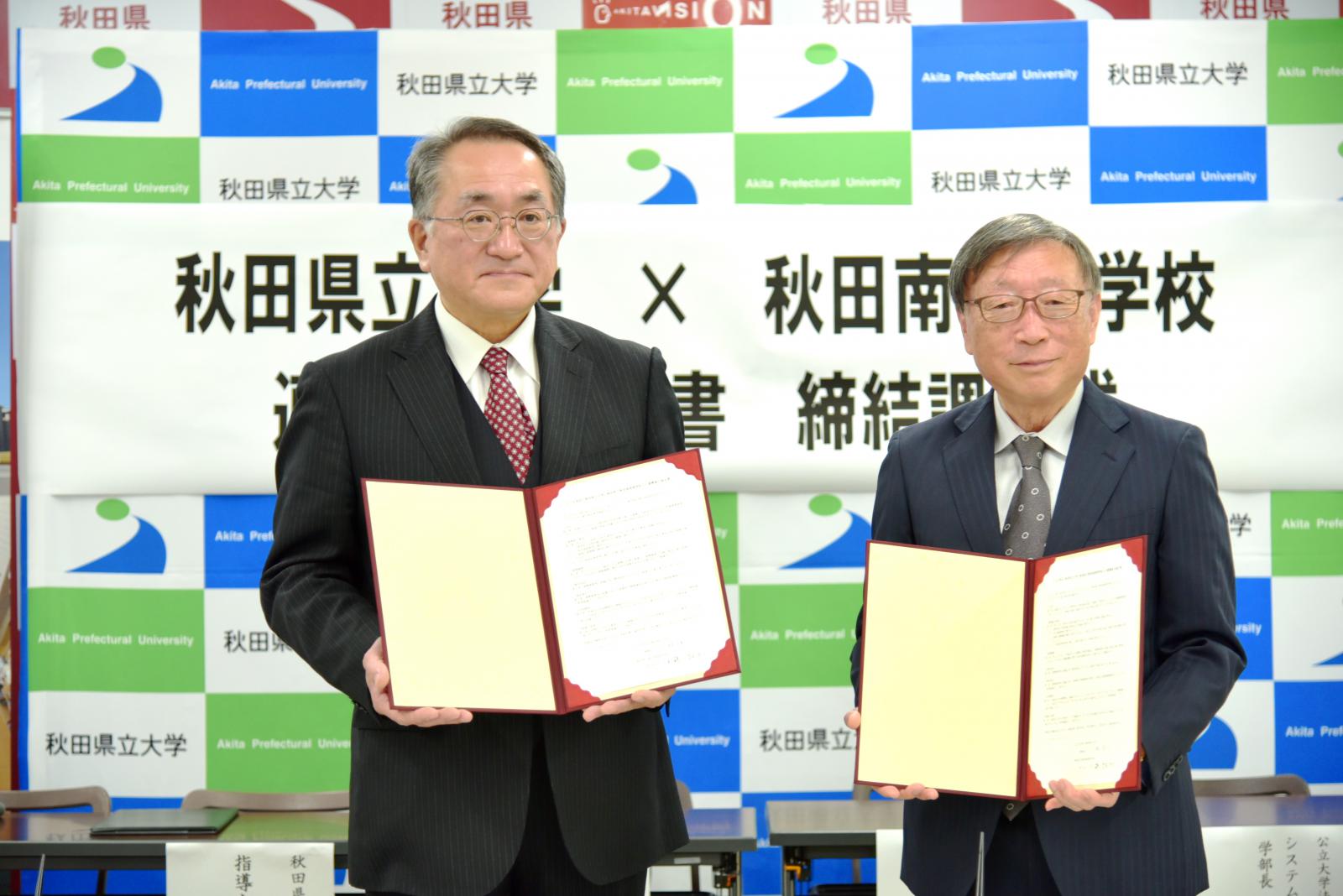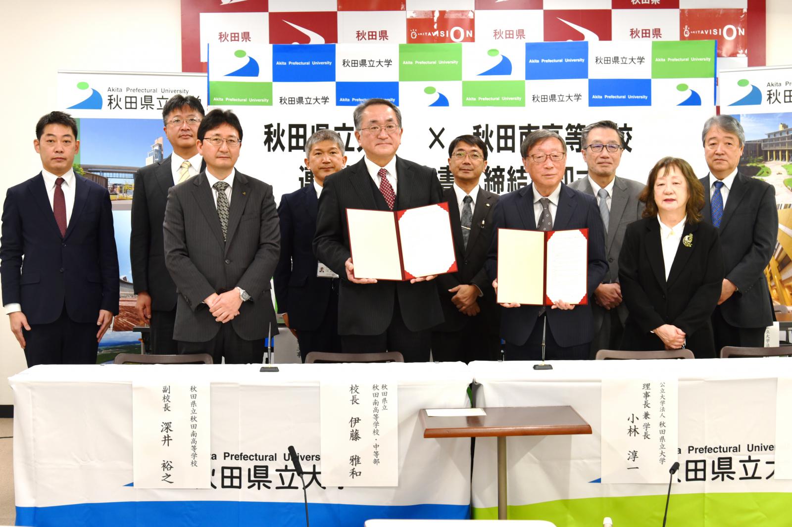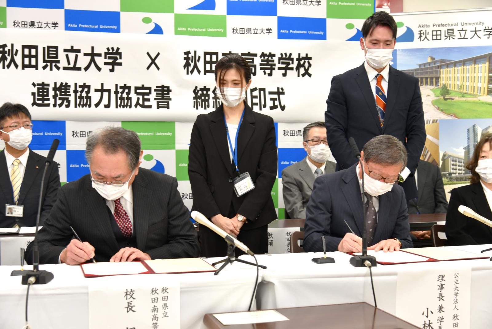11月15日(火)、秋田県立大学(小林 淳一 理事長兼学長)と秋田県立秋田南高等学校(伊藤 雅和 校長)は連携協力に関する協定を締結しました。秋田南高校は、平成27年度から31年度までの5年間、文部科学省の「スーパーグローバルハイスクール(SGH)」として、グローバルリーダー育成の研究指定(構想名:「こまちの里」秋田の高校生が「地球村」の食糧問題に挑む!)を受け、本学の教員も同校に赴き、農と食に関する世界的な課題についてグローバルな視点で考える取り組みを支援してきました。