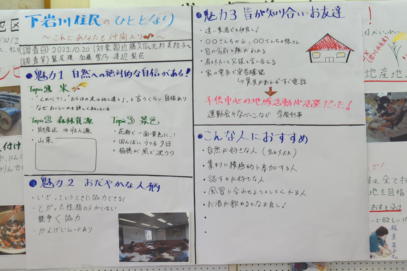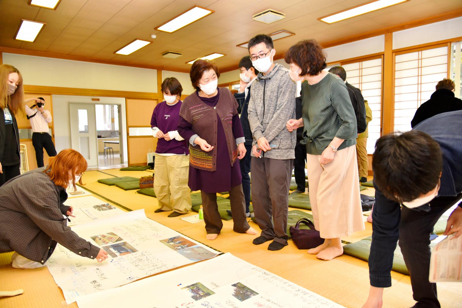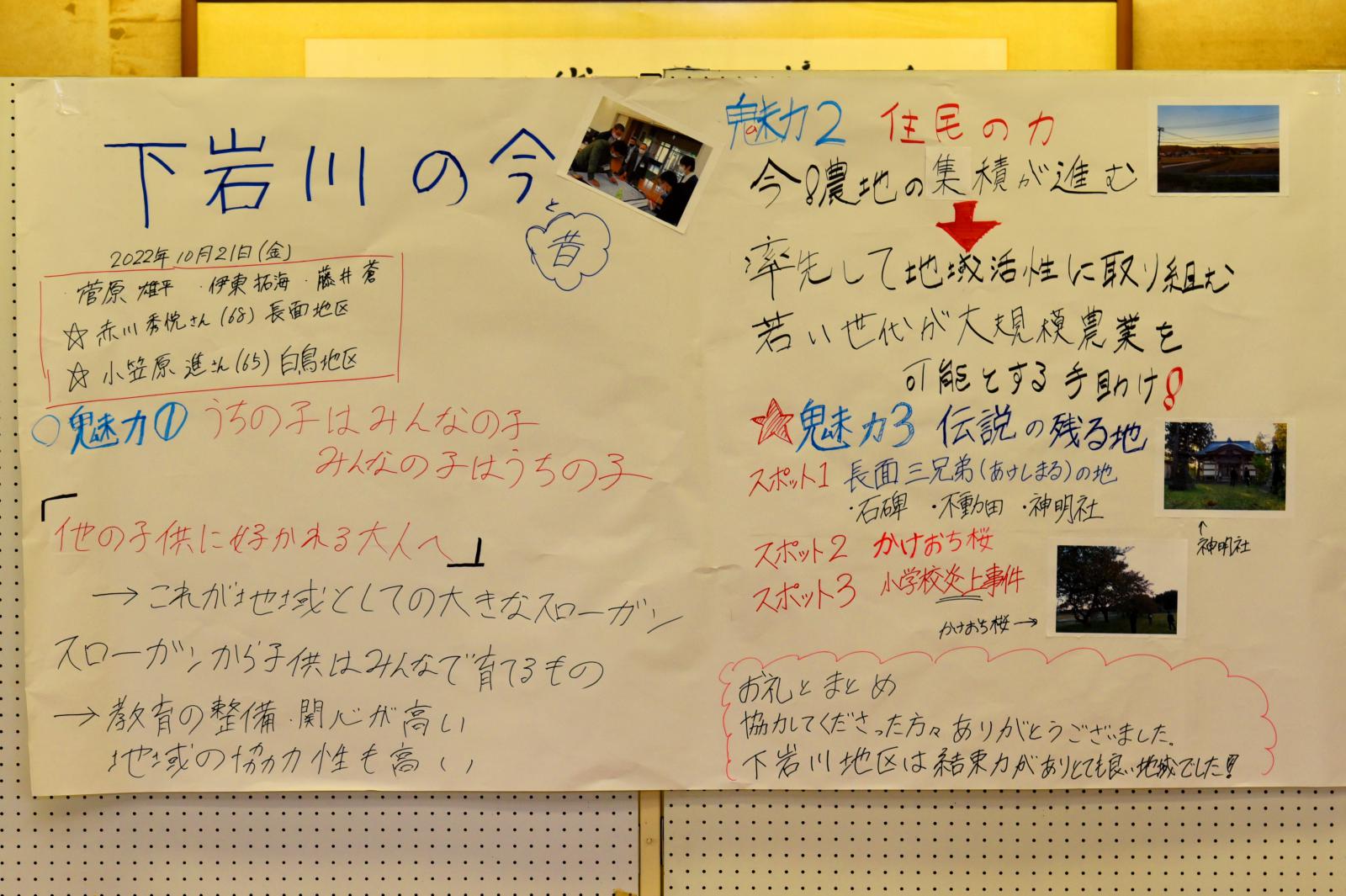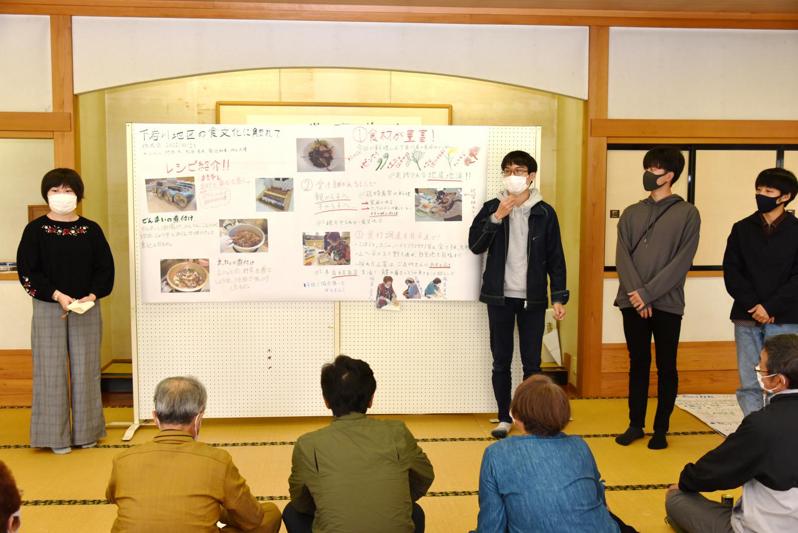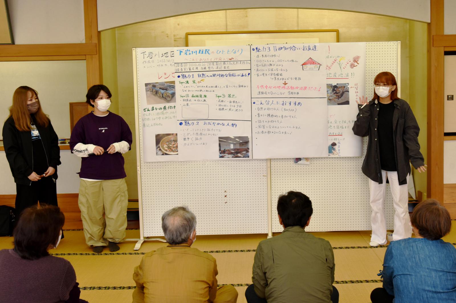 「食」「芸能」「人間力」「今と昔」をテーマとした4グループに分かれて住民から聞き取りを行いました。その内容を踏まえ、学生が感じた地域の魅力を3点、模造紙にまとめて発表するとともに、さらに魅力ある地域にするための方策について住民の方々とディスカッションをしました。