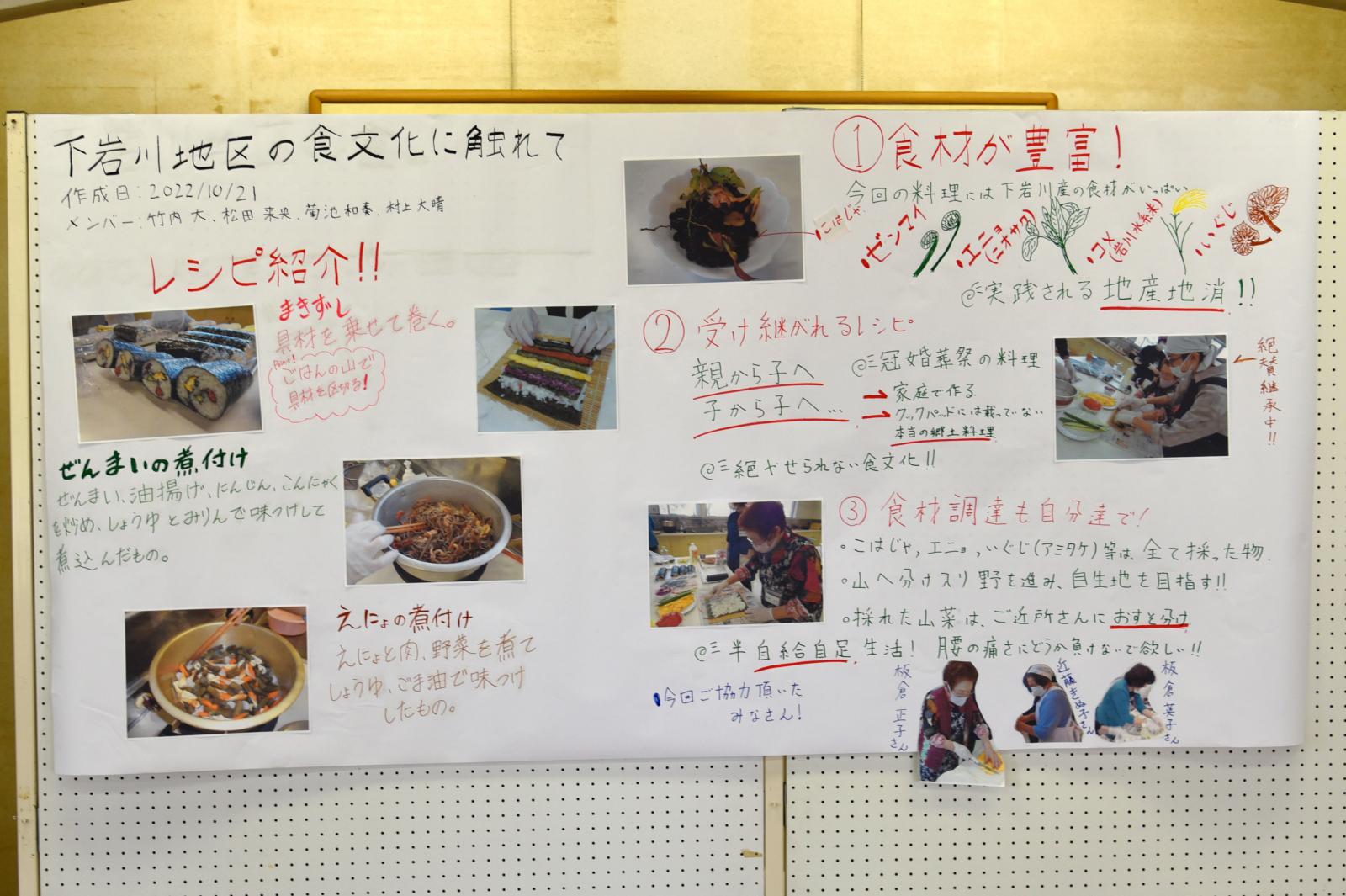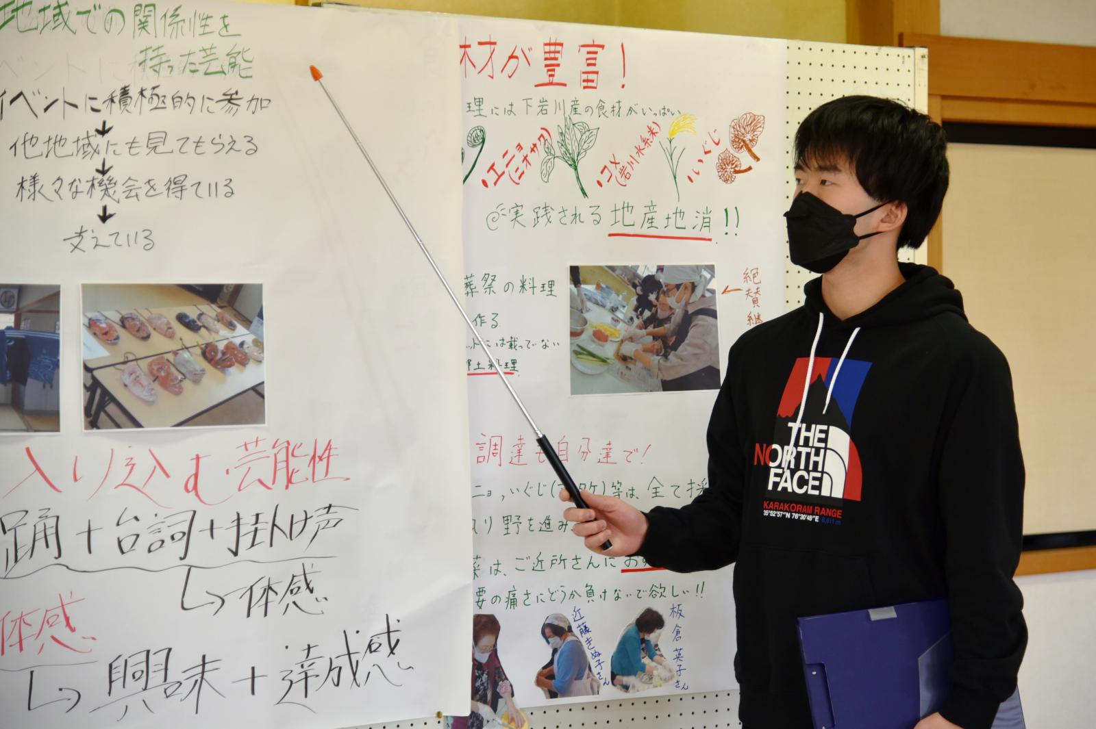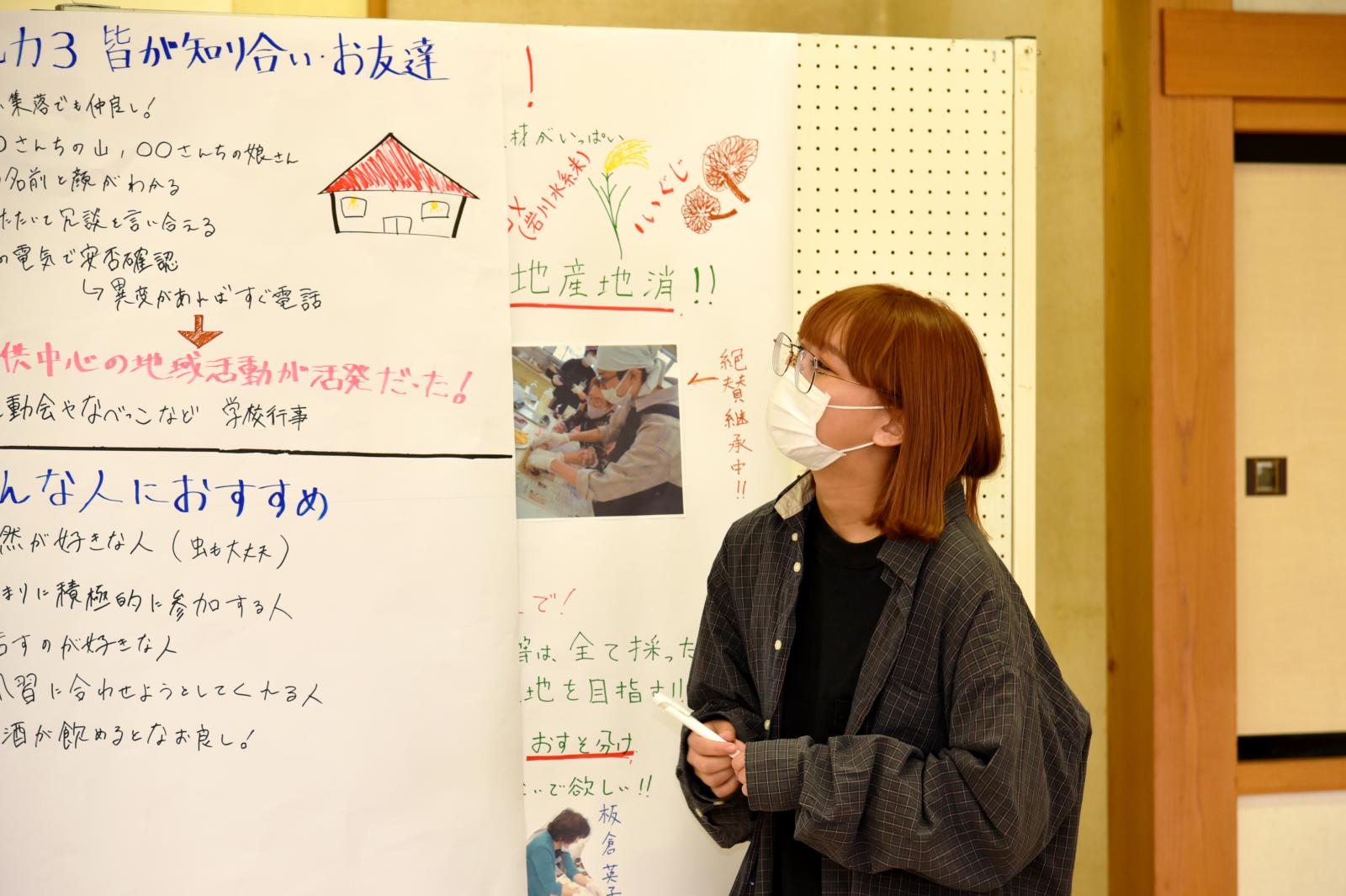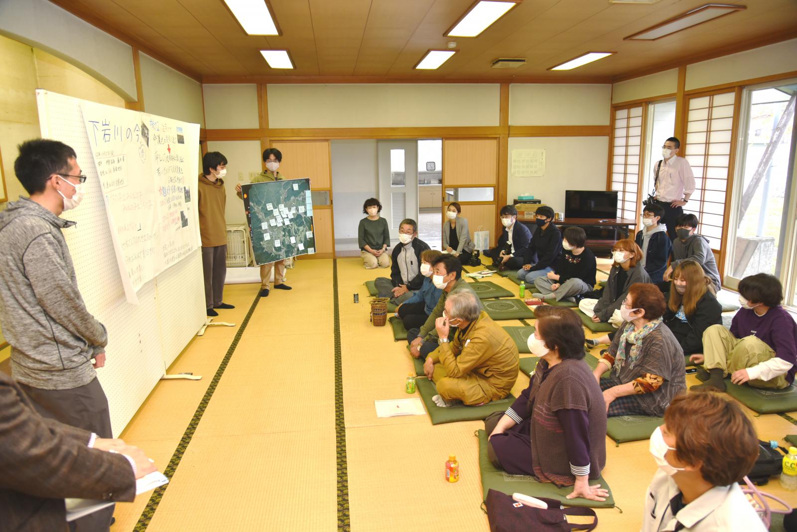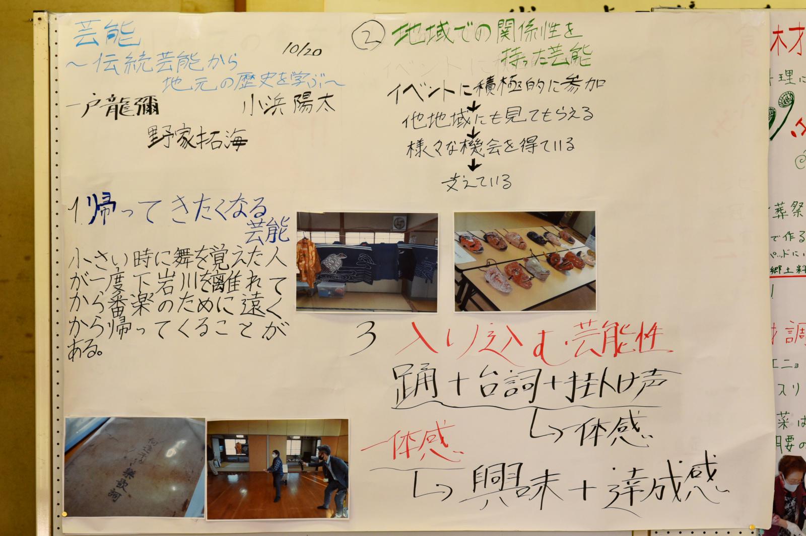 「食」「芸能」「人間力」「今と昔」をテーマとした4グループに分かれて住民から聞き取りを行いました。その内容を踏まえ、学生が感じた地域の魅力を3点、模造紙にまとめて発表するとともに、さらに魅力ある地域にするための方策について住民の方々とディスカッションをしました。