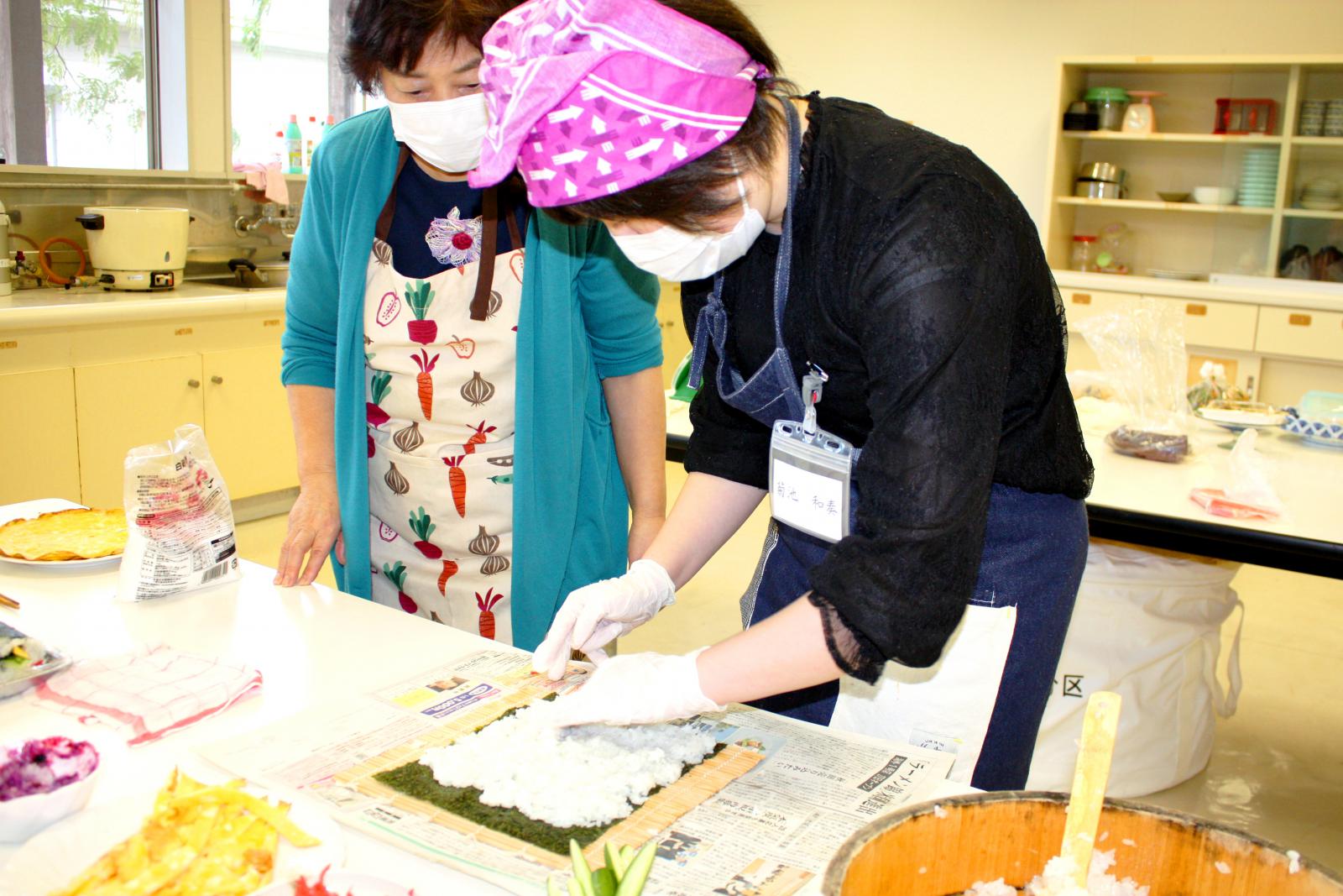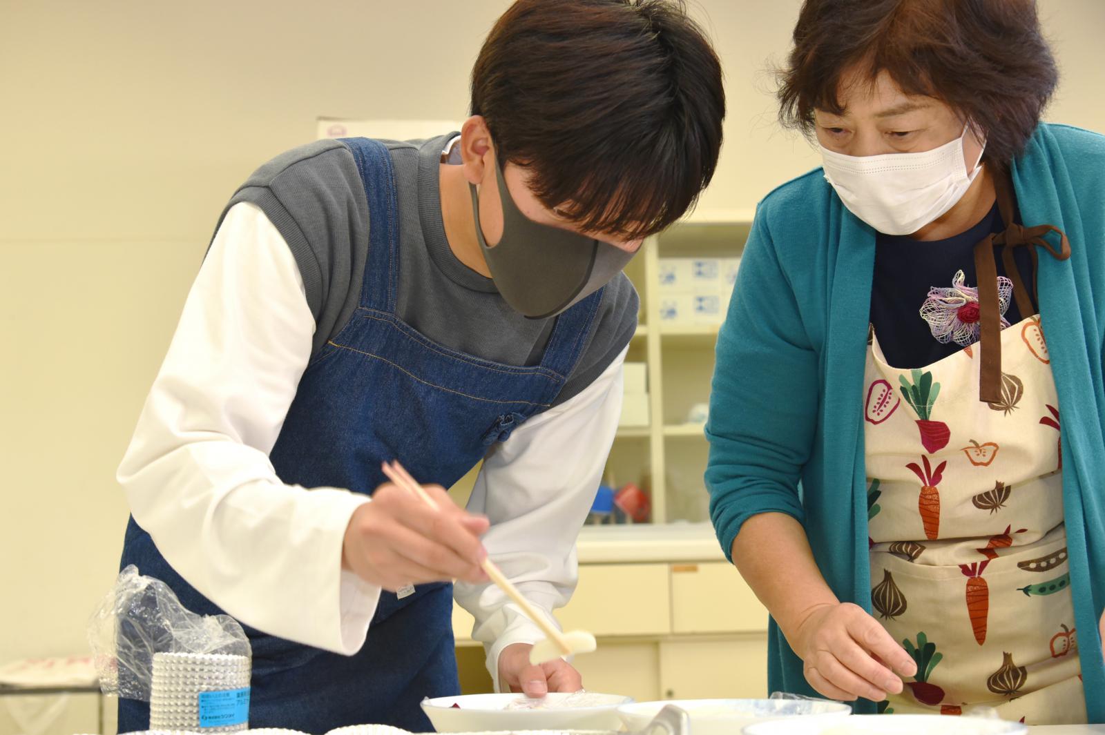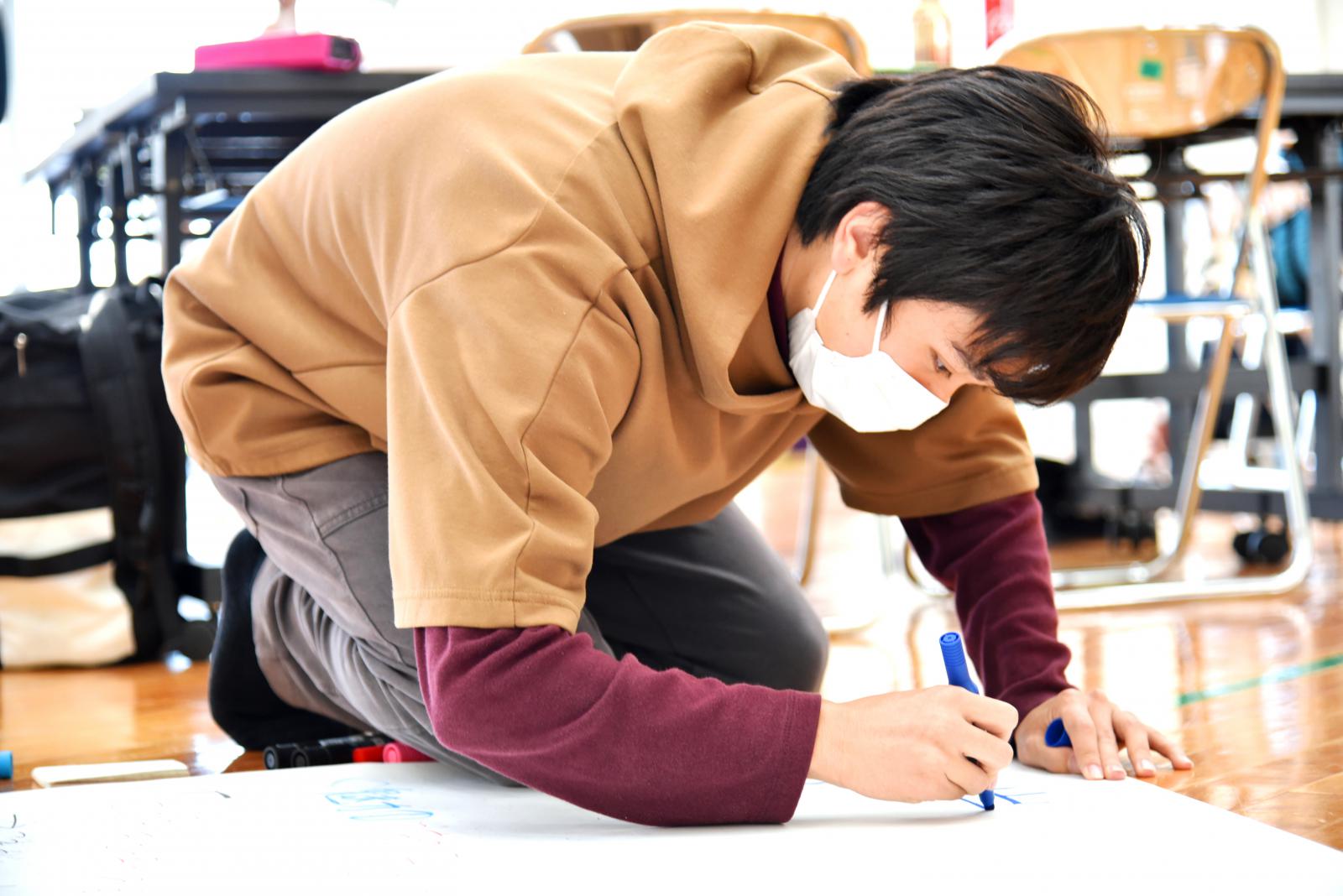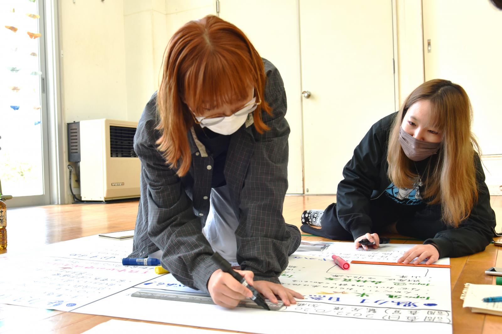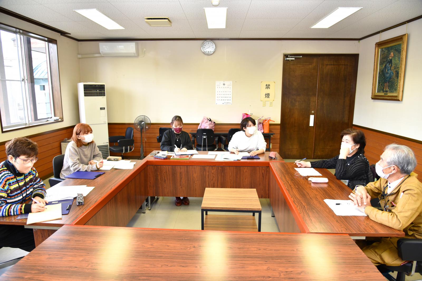 「食」「芸能」「人間力」「今と昔」をテーマとした4グループに分かれて住民から聞き取りを行いました。その内容を踏まえ、学生が感じた地域の魅力を3点、模造紙にまとめて発表するとともに、さらに魅力ある地域にするための方策について住民の方々とディスカッションをしました。
