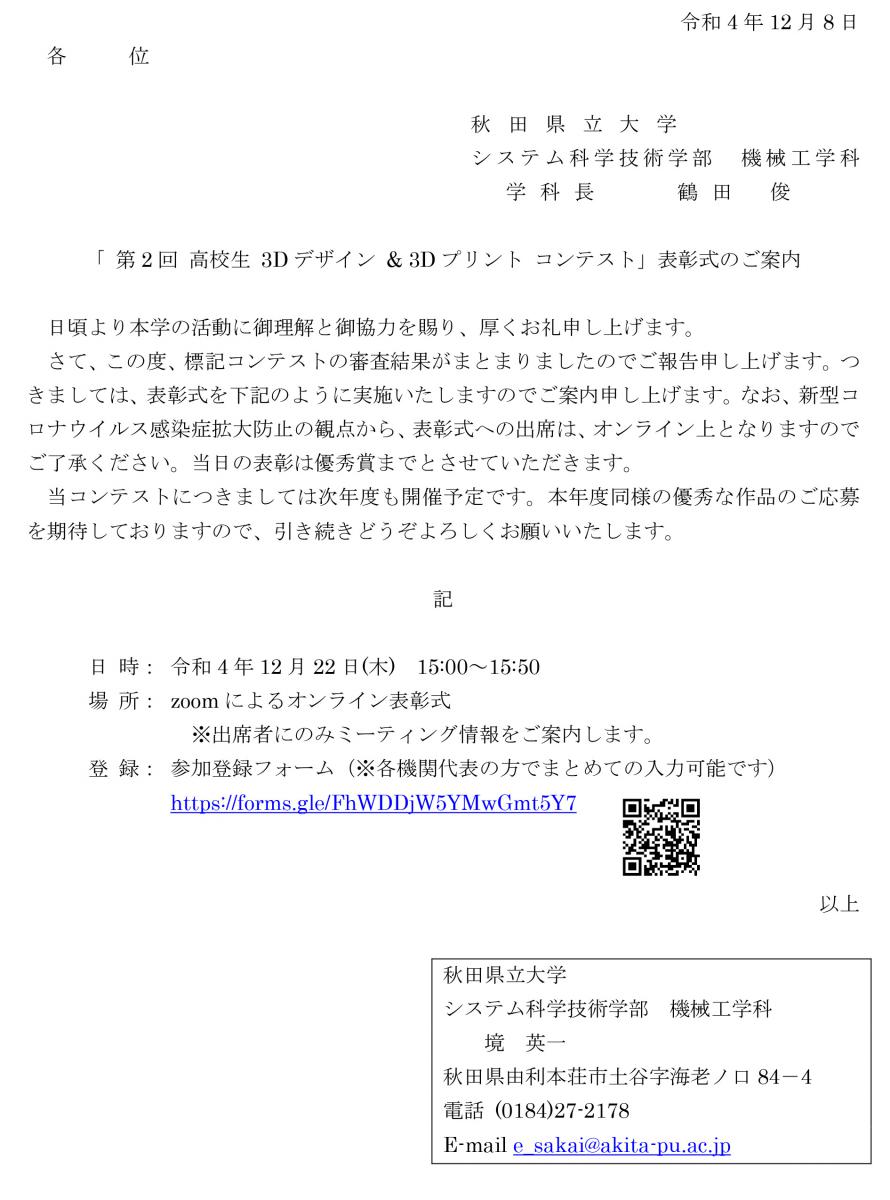 本学システム科学技術学部機械工学科が主催となり開催しました、「第2回高校生3Dデザイン&3Dプリントコンテスト」につきまして、たくさんのご応募いただき心よりお礼申し上げます。この度、本コンテストの審査結果がまとまりましたので、下記のとおり表彰式を実施いたします。日時