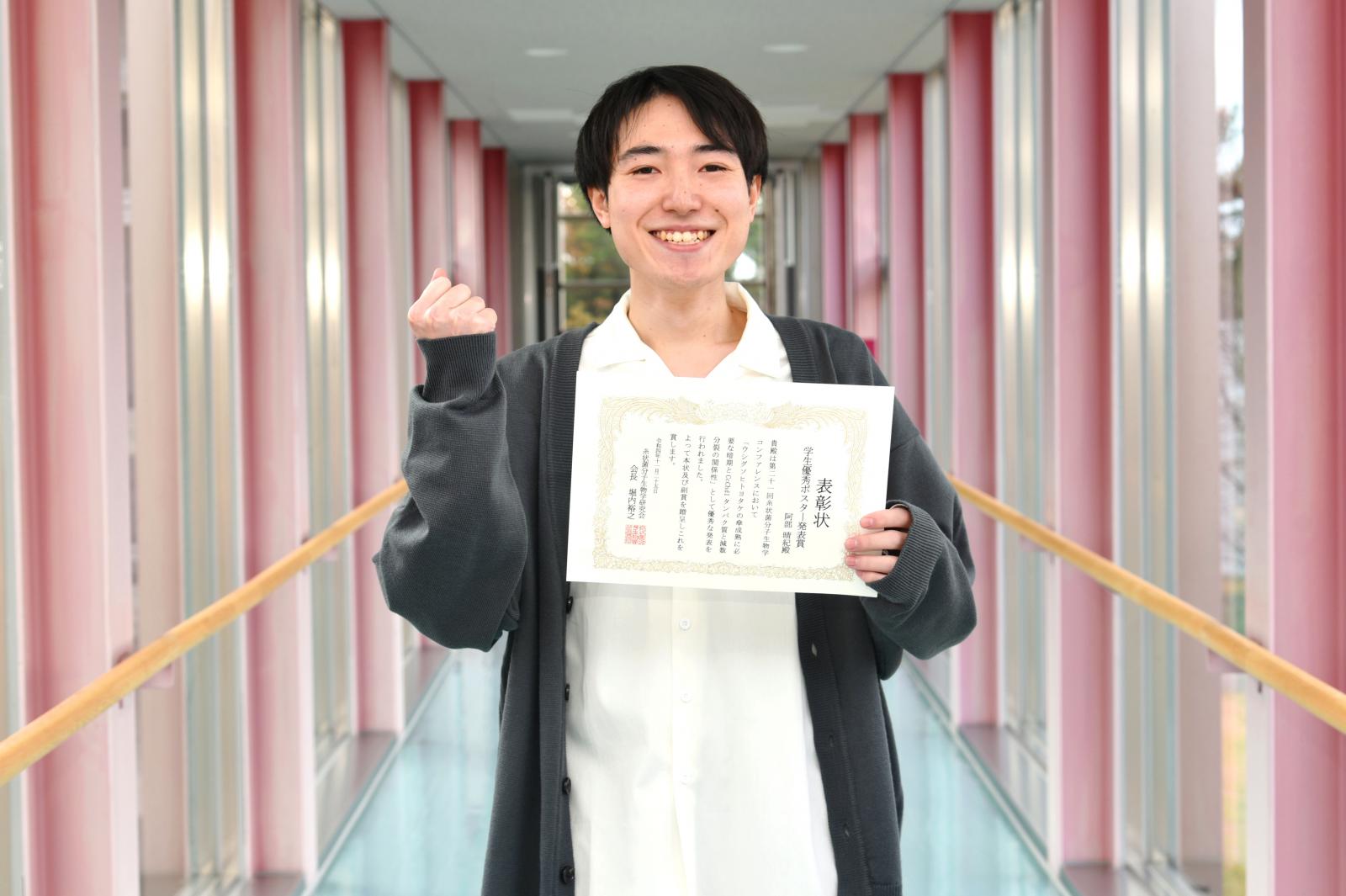 この度は、「第21回糸状菌分子生物学コンファレンス」において学生優秀ポスター発表賞を授与いただき、大変光栄に思います。私は幼い頃からキノコの研究をしたいと考えていたので、今回自分と先輩方が行った研究がこのように評価され、願いが叶ったという思いです。また今回の大会で様々なキノコ・菌類の研究者の方々と意見を交換でき、良い刺激となりました。私のキノコ人生はこれからが本番だと思い、先生や研究室メンバー、そして両親に感謝をしながら研究に励んでいきたいです。