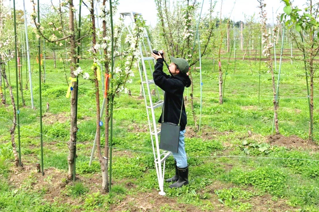 在学中は植物遺伝・育種研究室に所属し、農業的・商業的に有用なリンゴ受粉専用系統の選抜に関する研究に取り組みました。研究では主にそれらの生態的・形態的特性(開花量・果実形質など)について解析し評価しました。有用な系統とは何か考察した経験が、現在の生産現場と消費者の両者に最適な商品提案をする上で役立っています。