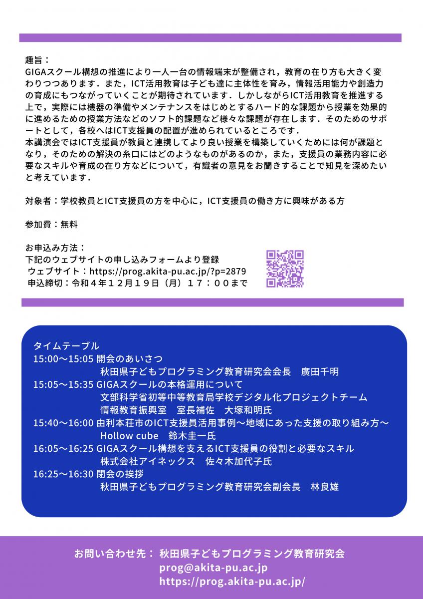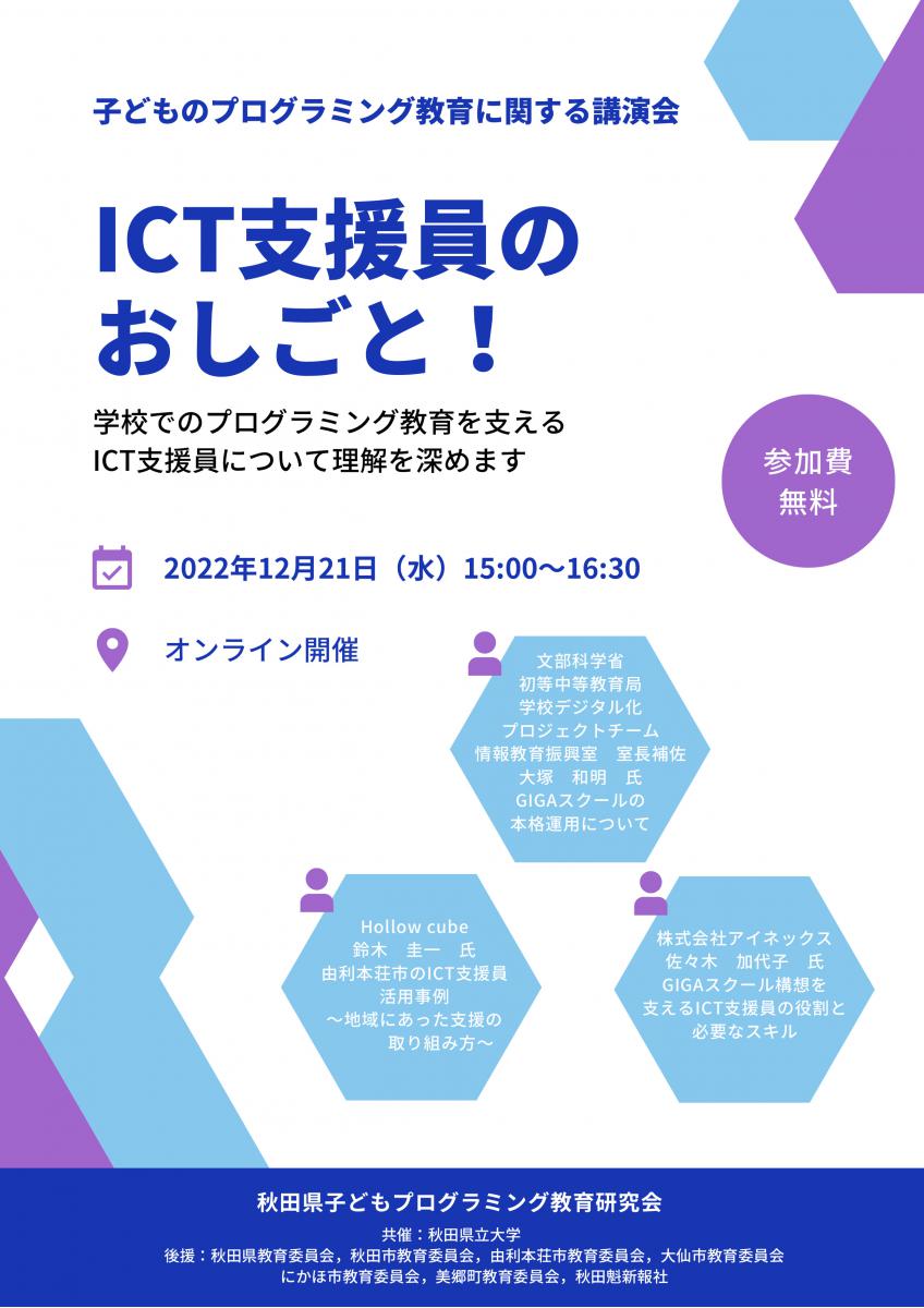 令和4年12月21日に子どものプログラミング教育に関する講演会を開催いたします。今年は、プログラミング教育を支える存在としてICT支援員をテーマとして、文部科学省初等中等教育局の大塚和明様やHollow cubeの鈴木 圭一 様、株式会社アイネックスの佐々木 加代子 様にご講演いただきます。お申込方法など、詳しくは下記のチラシやこちらをご覧ください。