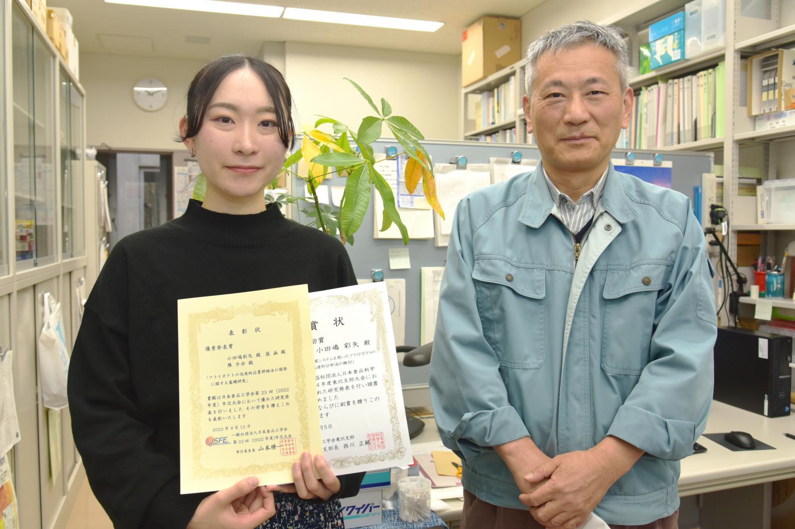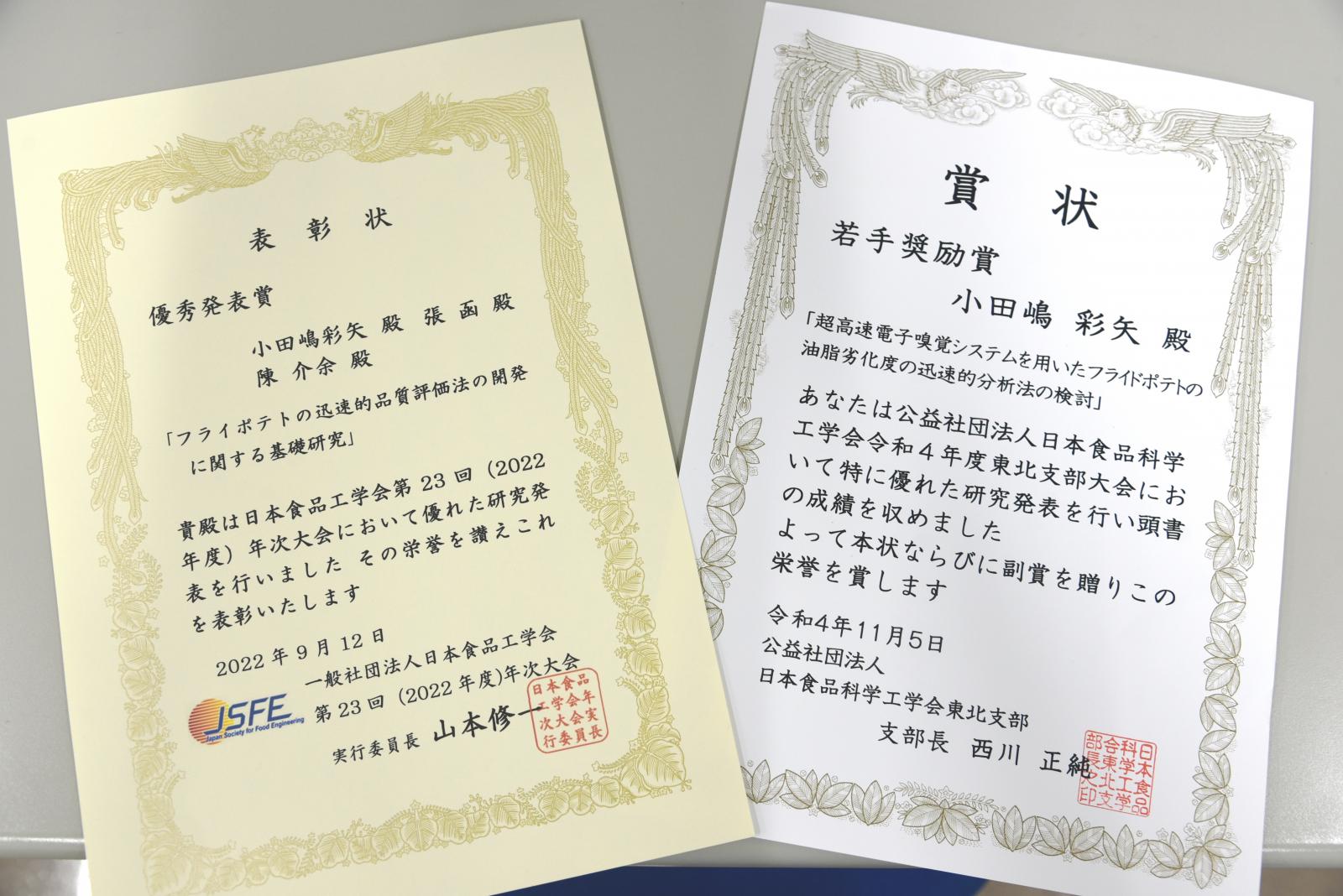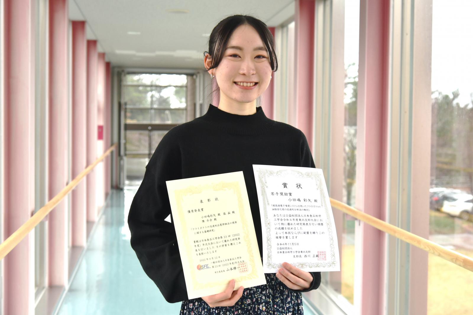 この度、大学院・生物資源科学研究科 博士前期課程1年の⼩⽥嶋 彩⽮さんが、「公益社団法人日本食品科学工学会令和4年度東北支部大会」において若⼿奨励賞、「日本食品工学会第23回年次大会」で、見事、優秀発表賞を受賞しました。おめでとうございます!!受賞した⼩⽥嶋 彩⽮さん