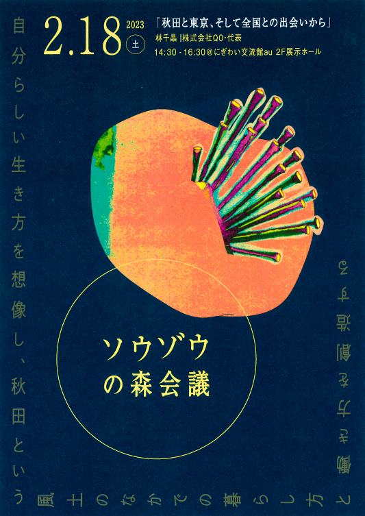 「ソウゾウの森会議」は自分らしい生き方を想像し、秋田という風土のなかで暮らし方と働き方を創造する人々が集う場で、秋田という固有の土地に暮らしながら、世界のどこに持っていっても普遍的に通じる、意味性をもった仕事を生み出す人々が集う”森”のような場をつくることを目的に、100人の起業家精神を持った人々の生態系をつくり、そこから次の100人が自然発生するような仕掛けづくりを目指しています。※会議は全4回の開催が予定されており、日程、講演者等は以下のとおりです。