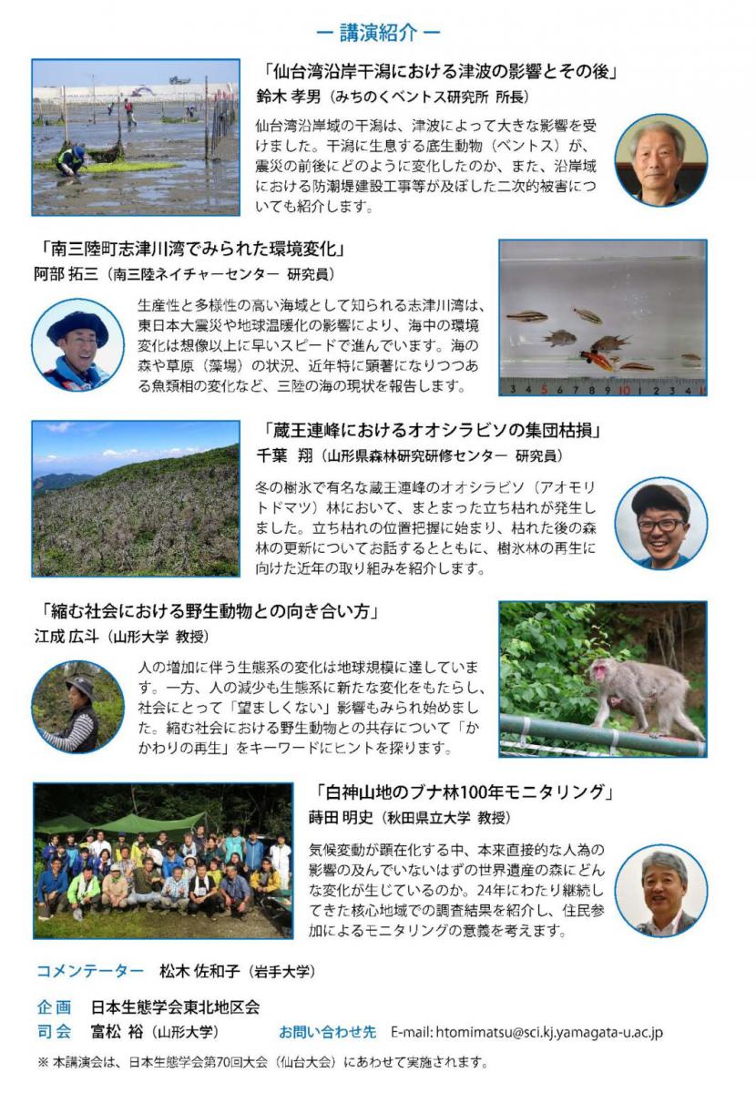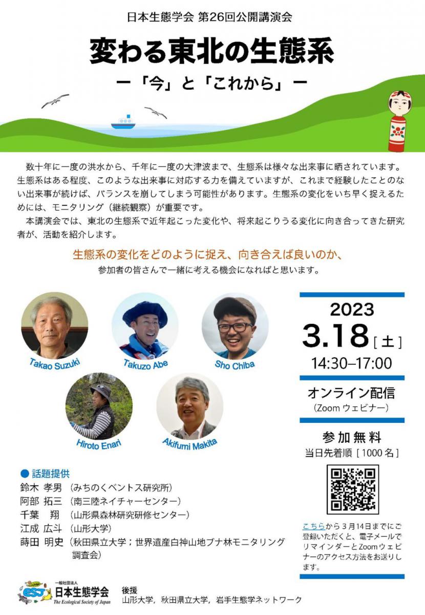 3月18日(土) 、 Zoomウェビナーオンライン配信により、本学が後援する『日本生態学会第26回公開講演会 変わる東北の生態系-「今」と「これから」-』が開催されます。