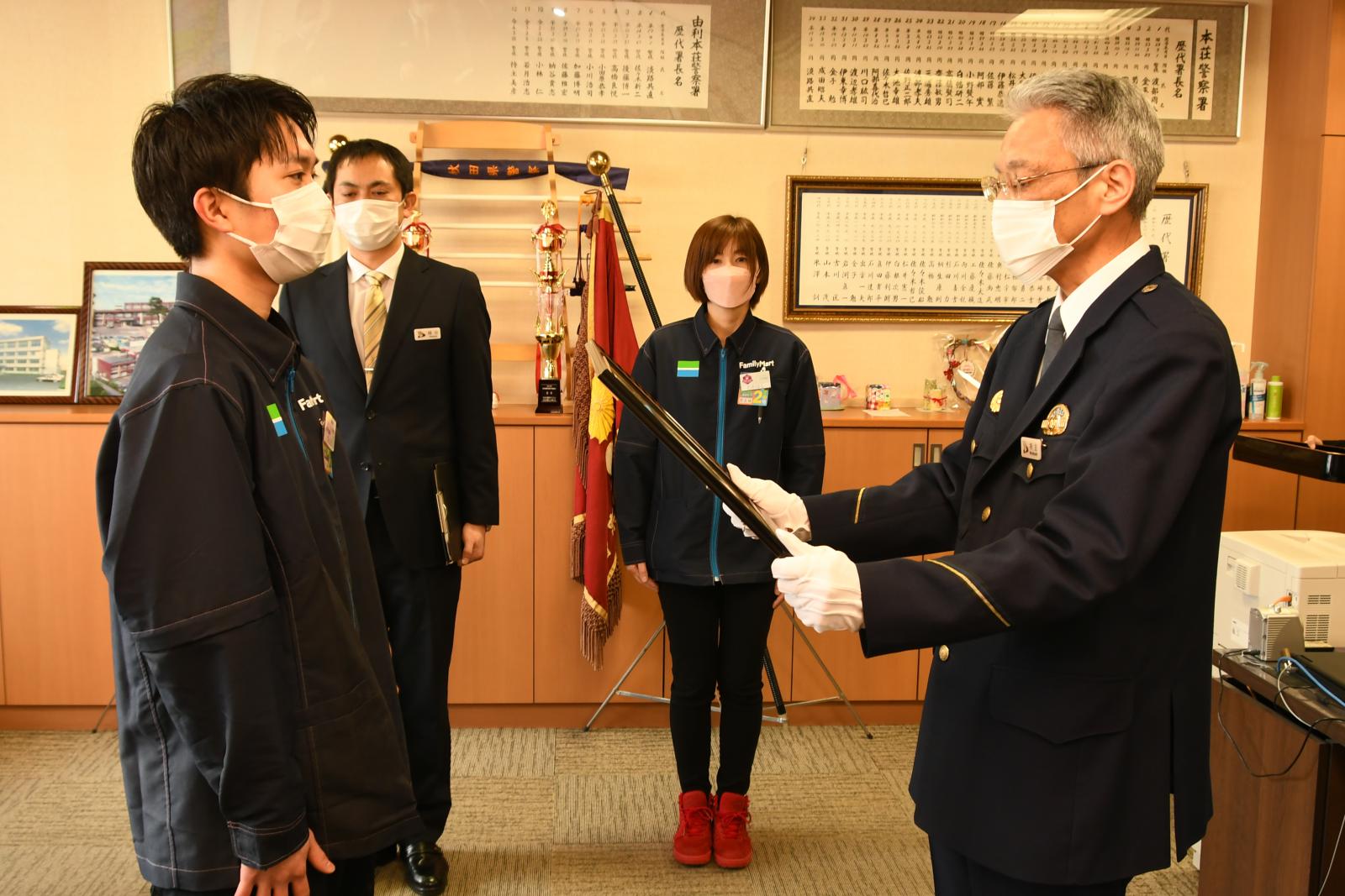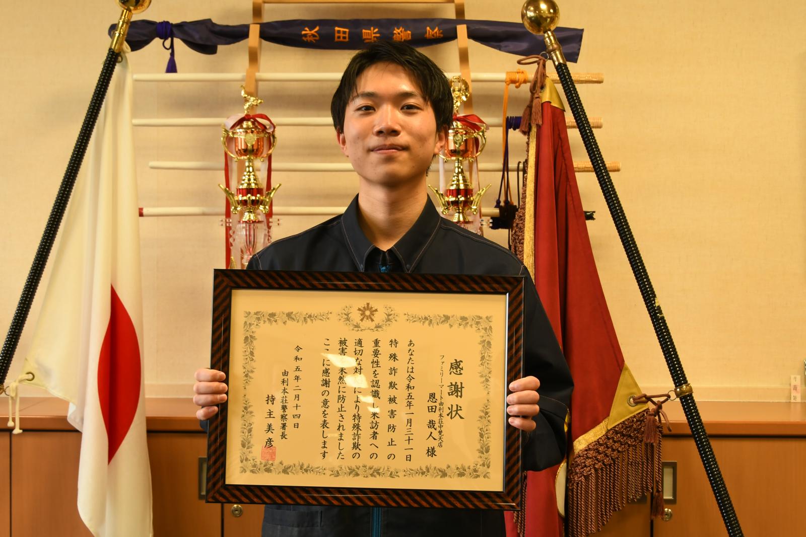 本学システム科学技術学部経営システム工学科3年生の恩田 哉人 さんが、特殊詐欺被害の防止に貢献し、2月14日に由利本荘警察署より感謝状が贈られました。恩田さんは1月に、アルバイト先のコンビニエンスストアで、接客をしていたお客さんから、電子マネーを振り込むように指示をされた内容のメールを提示されたことで、特殊詐欺である可能性を感じ取り、警察への通報に繋げました。