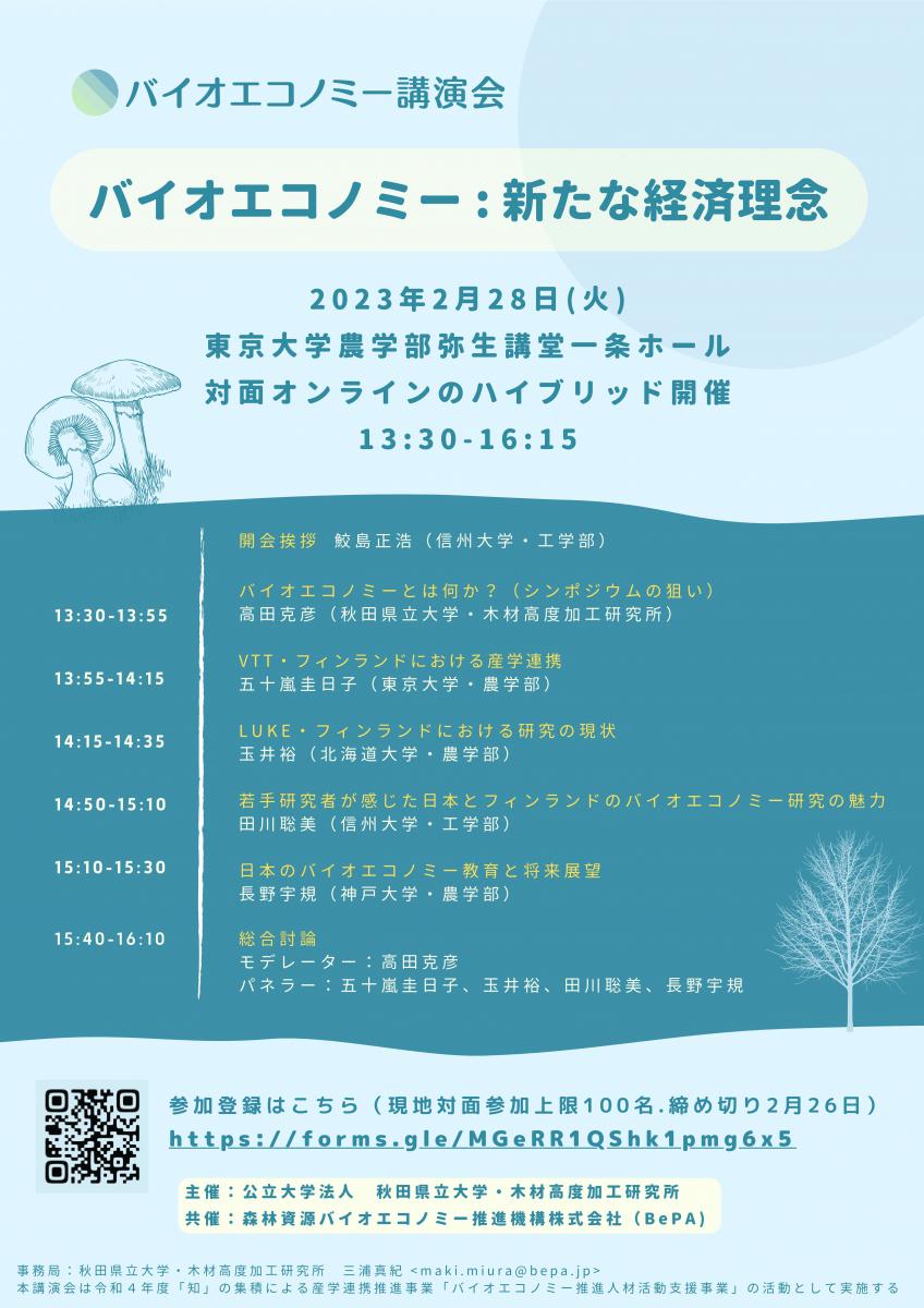 2月28日(火) 、東京大学を会場に、対面とオンラインのハイブリット式により、本学主催の『バイオエコノミー講演会 バイオエコノミー:新たな経済理念』が開催されます。