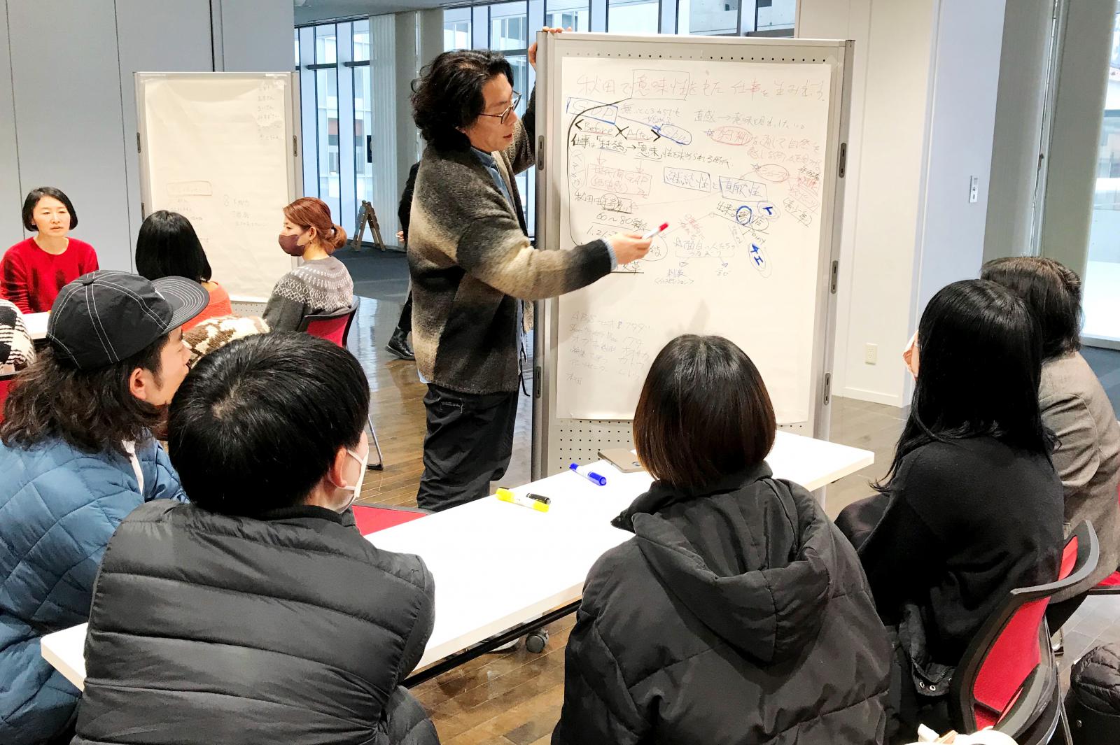 本学木材高度加工研究所の高田 克彦 教授・所長がプロジェクトリーダーを務める、秋田県立大学、国際教養大学及び秋田公立美術大学の連携プロジェクト『技術x教養xデザインで拓く森林資源活用による次世代に向けた価値創造共創拠点』の一環として、2月18日(土)、秋田市・にぎわい交流館 auを会場に、「第4回ソウゾウの森会議」が開催されました。今回の会議では、林 千晶(株式会社Q0代表)から、「秋田と東京、そして全国との出会いから」と題して、「事業を創りたい人」、「事業を応援する人」によるワールドカフェを実施しました。参加した約50名は9つのテーブルに分かれて、地域共創や起業、秋田の可能性などについて終始活発なディスカッションが展開され大変有意義な機会となりました。
