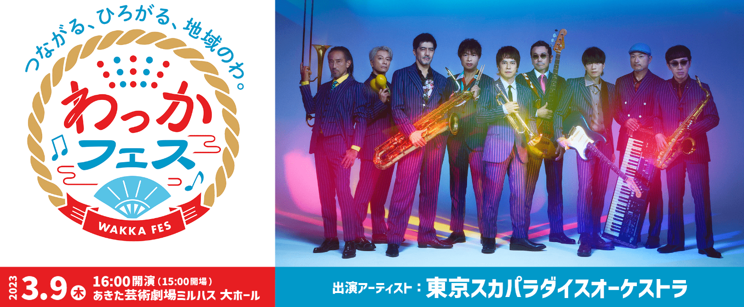 令和5年3月9日(木)、あきた芸術劇場ミルハス大ホールで開催される「わっかフェス」に、秋田県立大学竿燈会が出竿します。「わっかフェス」は、AAB秋田朝日放送などが主催し、未来を担う若者たちやアーティストと一緒に郷土や伝統芸能の魅力を発信しながら、地域を盛り上げていくイベントで、当日は、東京スカパラダイスオーケストラや秋田県横手市出身のシンガー・ソングライター高橋優さんが出演し、秋田の伝統芸能や若者たちとのコラボレーションにより、秋田の魅力が発信される予定です。