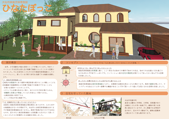 秋田県空き家リノベーションデザインコンテストで、伊藤 香乃 さん(建築環境システム学科計画学講座3年)の作品が、最優秀賞を受賞しました。大仙市の空き家を、病後児保育施設にする提案で、建物の特徴と、周辺にある関連施設などの分析をふまえた提案が、総合的に優れていると評価されました。また、佐藤 海翔 さん(建築環境システム学科計画学講座4年)と布谷 理乃 さん(同3年)のグループの作品は佳作を受賞するなど、優秀な成績をおさめました。