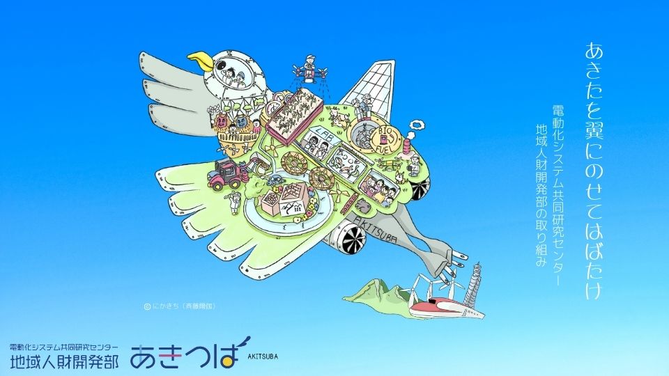 あきつばは、電動化システム共同研究センターを中心に進めている秋田県の内閣府交付金事業「小型軽量電動化システムの研究開発による産業創生」において、開発される「新世代モーター」や「電動化システム」、そしてそれらと親和性の高い「再生可能エネルギー」について、中高生のみならず、小学生から社会人まで幅広く情報発信や啓発を行い、地方で活躍する理系人材の開発を推進する役割を担っています。また、若年層に対する理系への進路選択支援のほか、地域で活躍する女性とのコミュニケーション機会や地域課題を自分事として考える機会を提供することにより、県内理系大学進学や県内就職への関心を促しています。