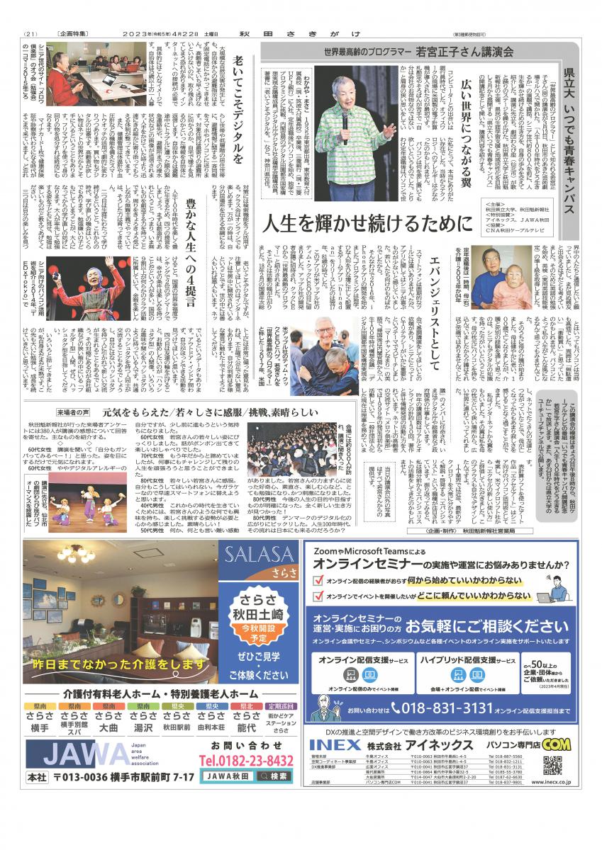 令和5年4月22日(土)付け秋田魁新報に、生涯学習プログラム『いつでも青春キャンパス』若宮正子さん講演会の詳報記事が全面掲載されました。本掲載には、株式会社アイネックス様、株式会社JAWA様から多大な御支援をいただきました。この場を借りて厚く御礼を申し上げます。本講演会の模様は、本学公式You Tube(AkitaPrefecturalUniv)でも配信しているほか、本事業に特別協賛をいただいた秋田ケーブルテレビにて随時放映しています。