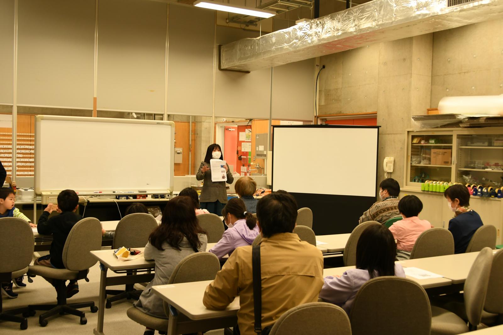 入会式終了後は、伊東 良太 助教(知能メカトロニクス学科)による、「光のいろいろ初級編~光のぬり絵で遊ぼう~」というテーマのもと、偏光板という特殊なフィルムと光の性質を用いた科学教室を実施しました。