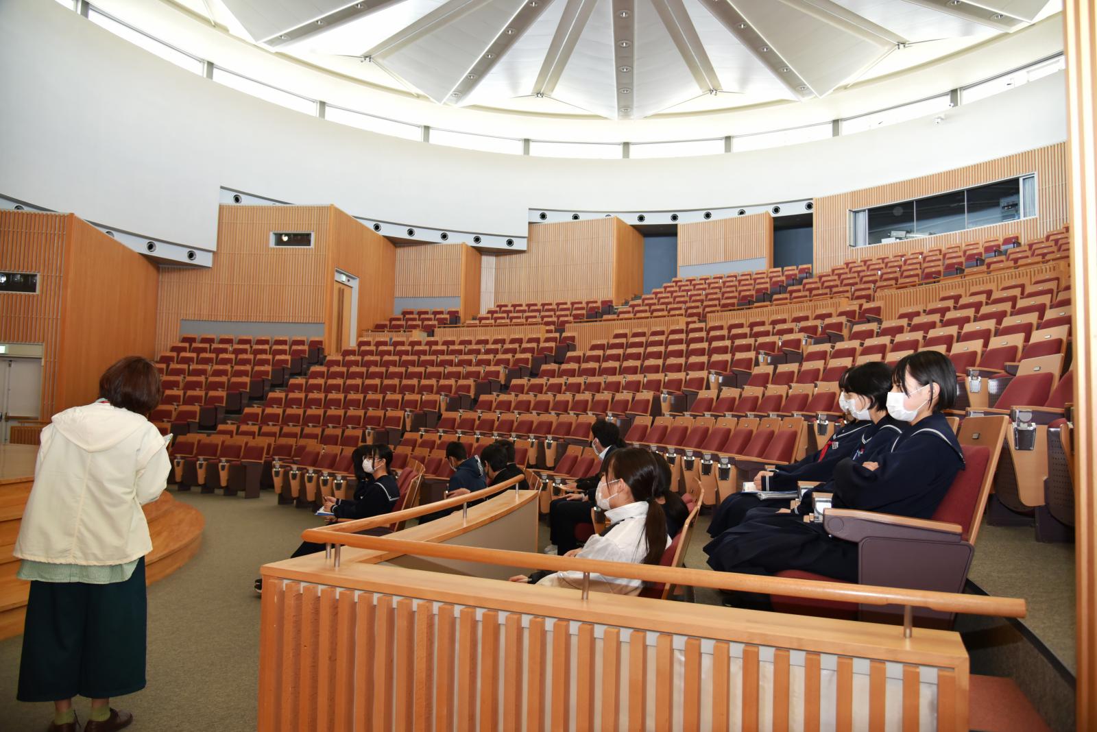 本学の概要説明や、中学と大学の講義や学びの違いなどについて説明を受けたあと、学生ホール、講堂、図書館など、本学の特長的な施設をじっくり周り、普段目にすることのない施設や研究機器をご覧いただくなど、広大なキャンパスを見学いただきました。