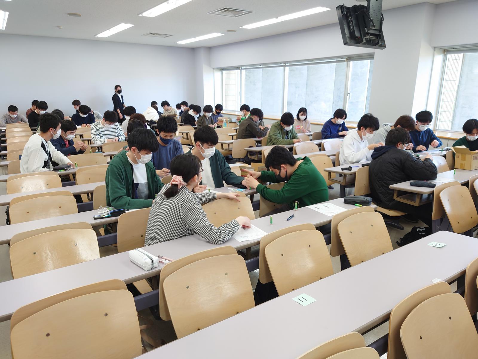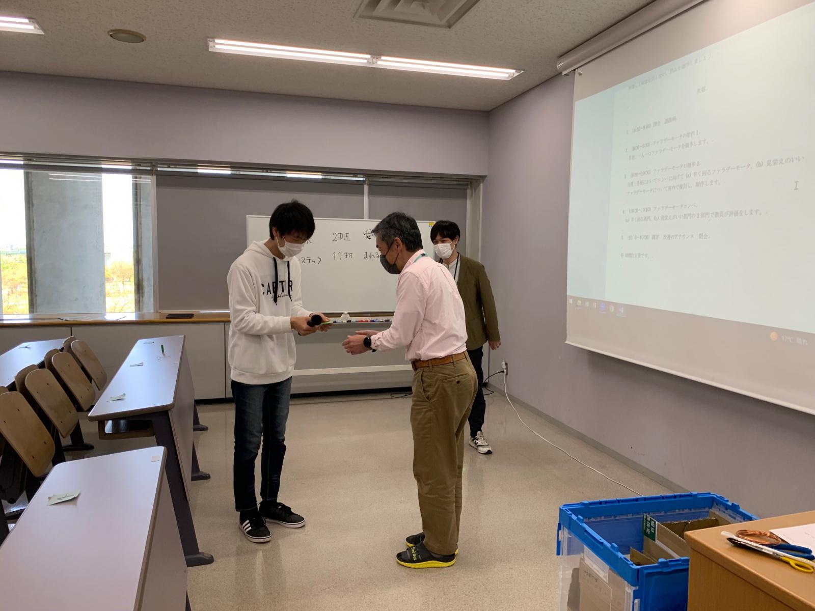 知能メカトロニクス学科では、学生の「ものづくり」への興味関心と学生同士の協働性を高めることを目的として令和5年5月1日創造科学の基礎の時間に「ファラデーモータ競技会」を開催しました。本イベントは知能メカトロニクス学科教員により、新入生研修の一環として毎年行われているものです。
