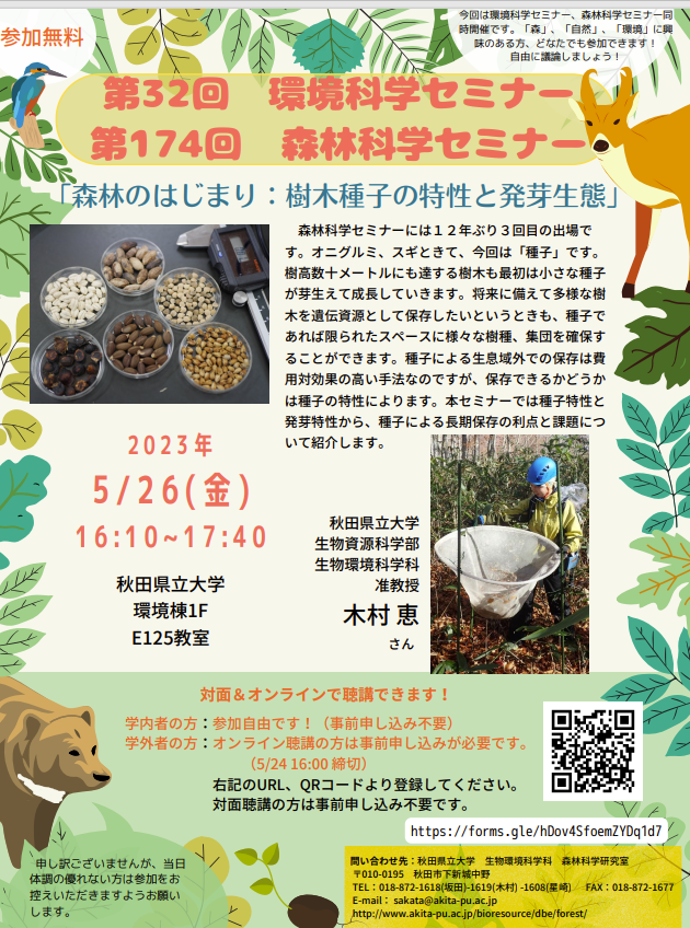 演 題:『森林のはじまり:樹木種子の特性と発芽生態』演 者:秋田県立大学 生物資源科学部 生物環境科学科 木村 恵 准教授