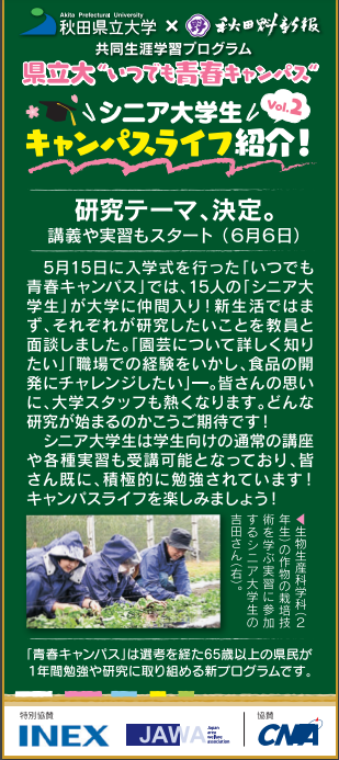 【秋田魁新報】「いつでも青春キャンパス」 研究室が決定! 研究テーマ、決定。講義や実習もスタート(6月6日付け秋田魁新聞) 本事業は、株式会社アイネックス様、株式会社JAWA様、協賛として、株式会社秋田ケーブルテレビ様の御支援をいただき運営しています。 生物生産科学科(2年次)の作物栽培の技術を学ぶ実習に参加するシニア大学生