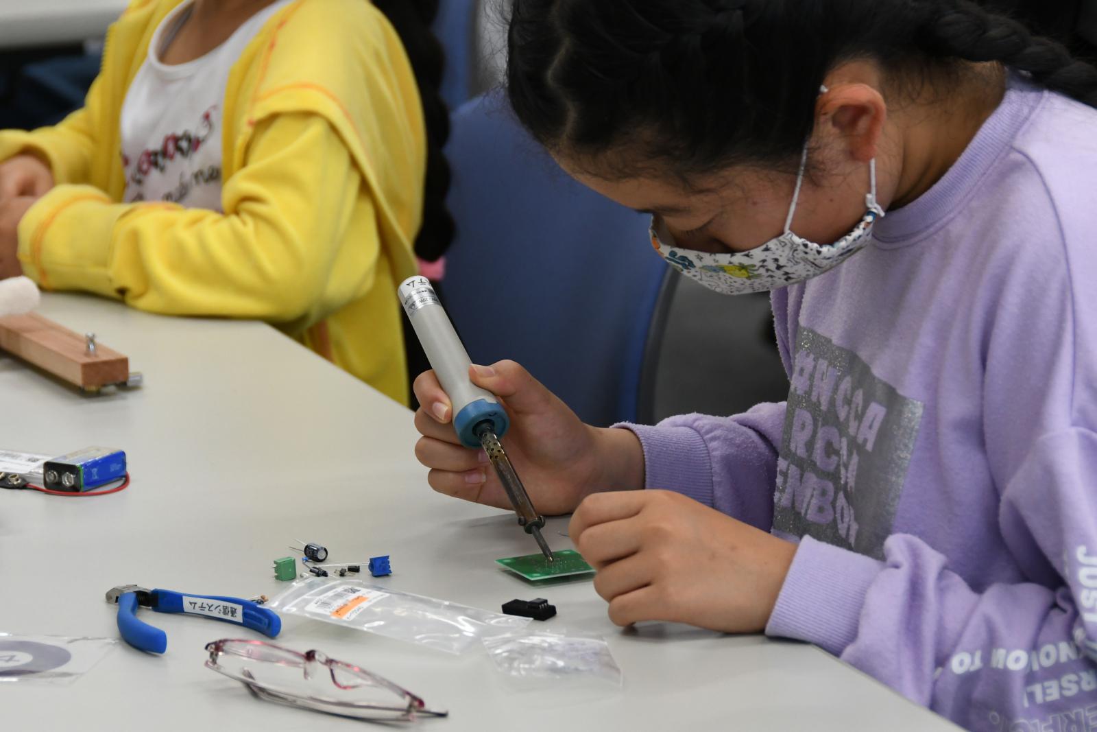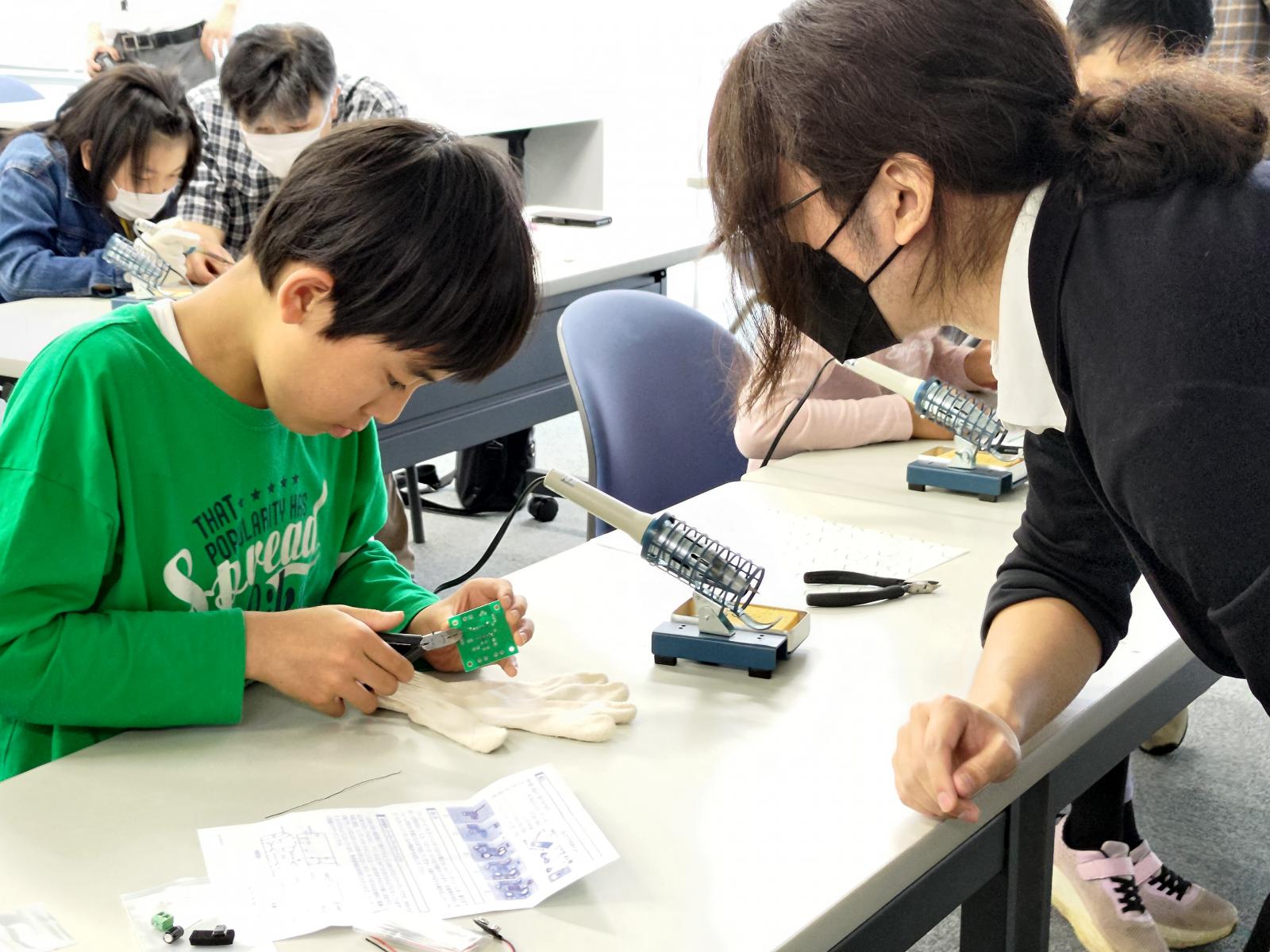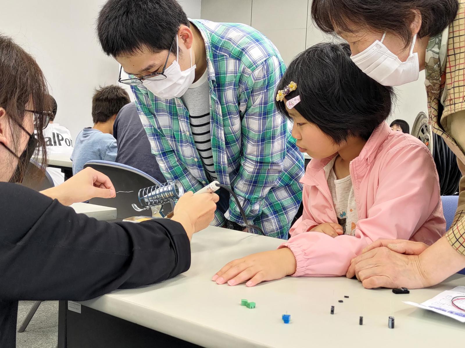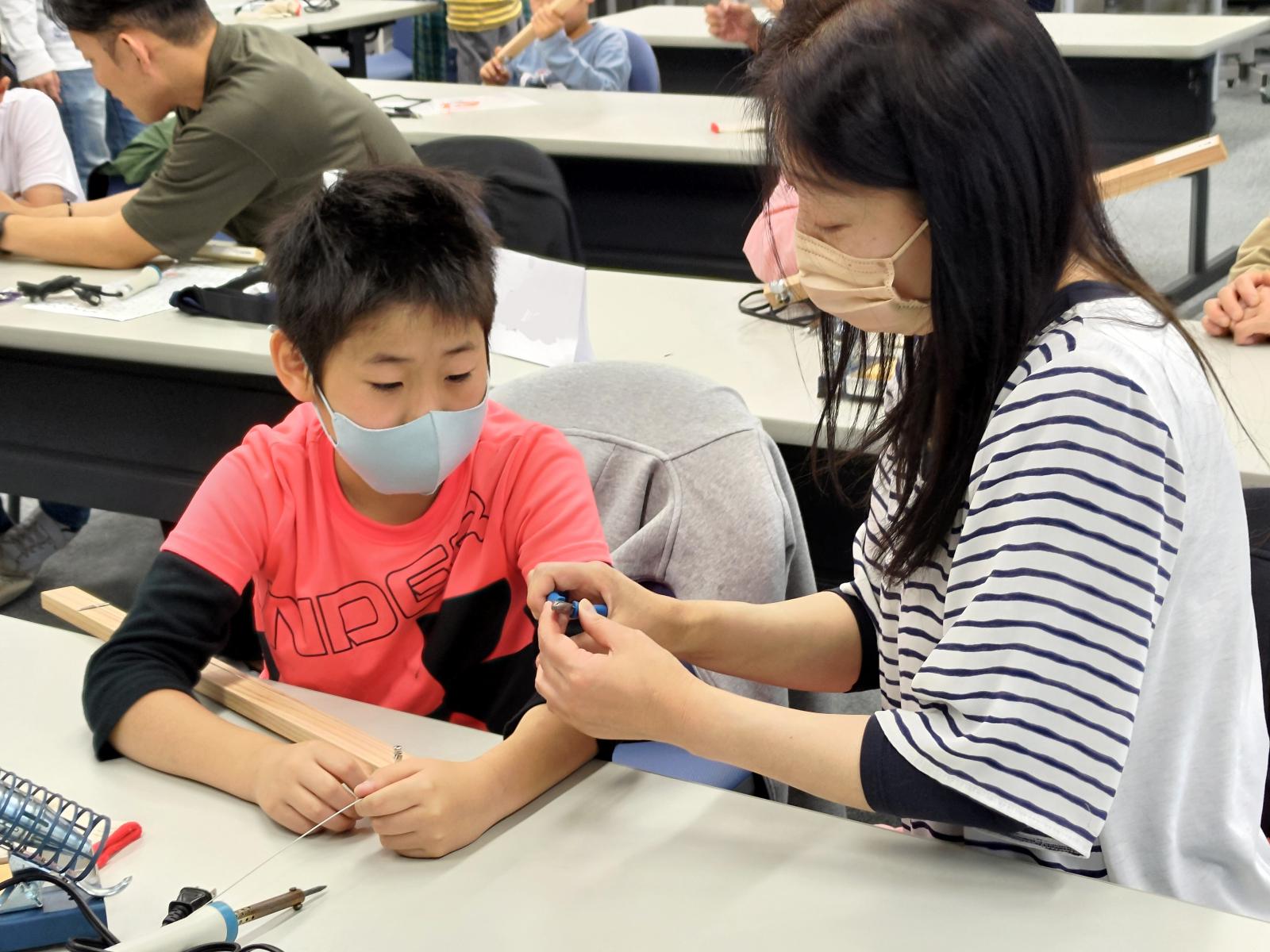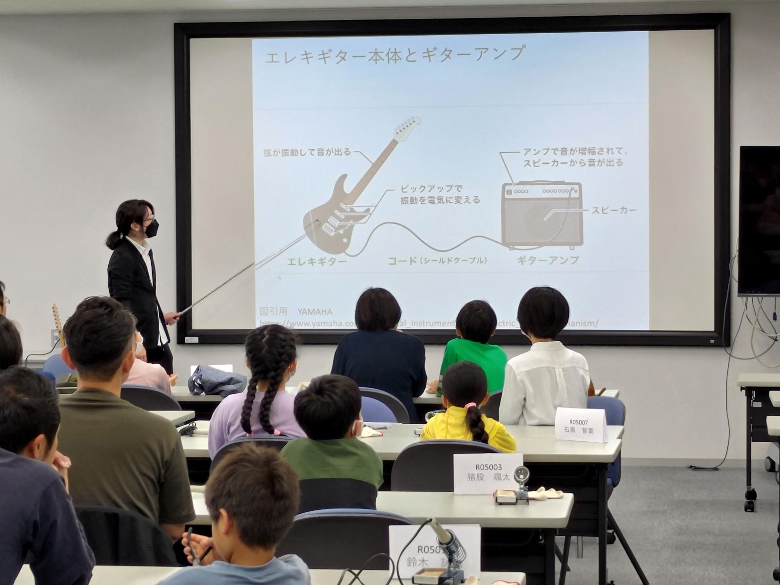 6月3日(土)に本荘キャンパスにて、第2回目となる創造工房クラブ活動を実施しました!今回は、秋元 浩平 助教(知能メカトロニクス学科)による、「エレキギターをつくってみよう!」というテーマで科学講座を実施しました。この講座では、ミュージシャンが使うエレキギターの構造から、小さな生音を電気回路で増幅させるしくみを勉強して、実際に電気で音が鳴るエレキギターをつくりました。今回ははんだごてを使って基盤に部品を付ける作業などもあり、苦戦している場面も見受けられましたが、学生スタッフや教員にサポートをしてもらいながら、エレキギターを製作することができました。