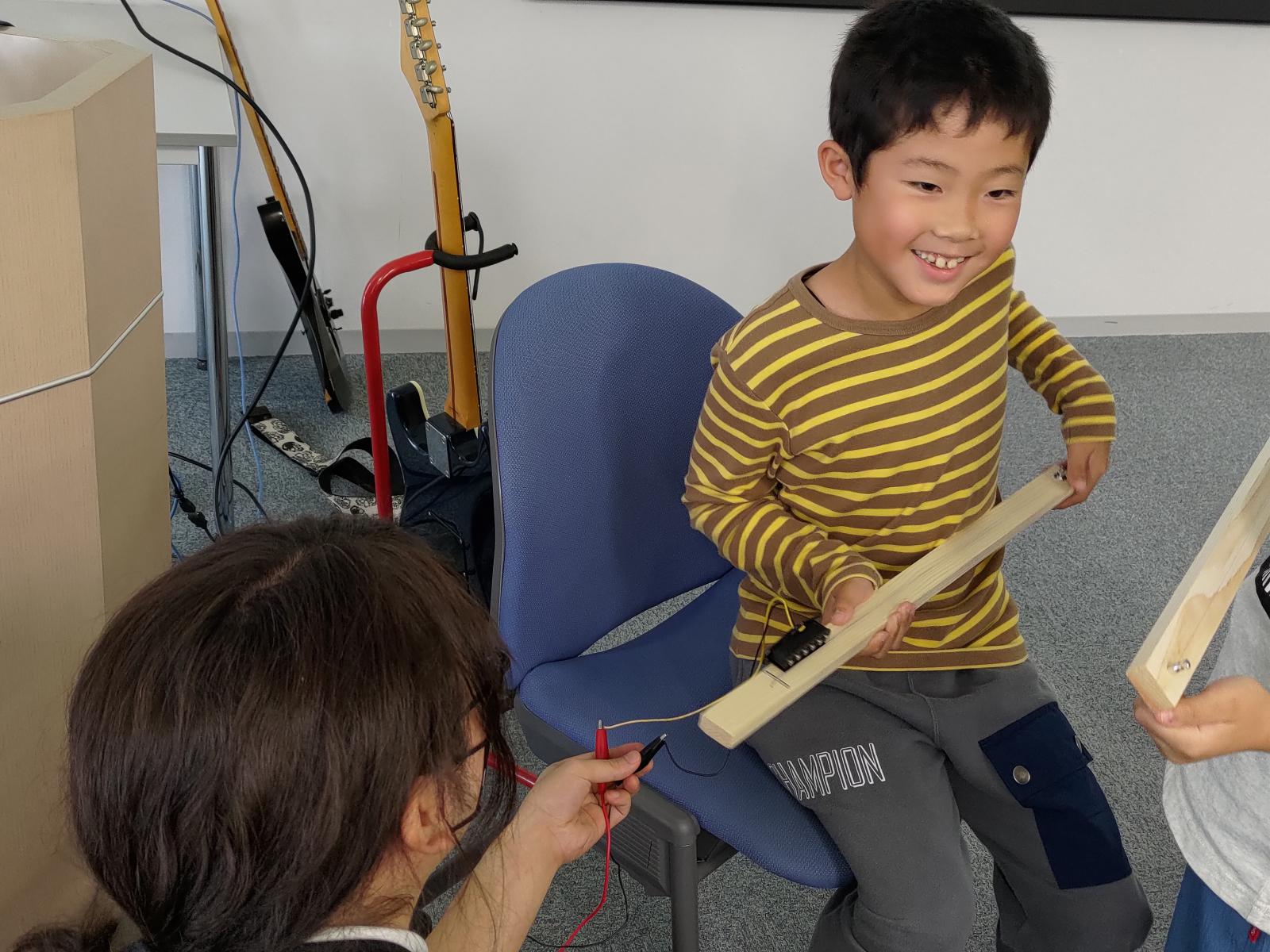 最後は、各々が製作したエレキギターを、ギターアンプに接続して演奏を体験しました。弦の太さや張り方の度合いによって音色が変わるため、多種多様な音色が教室に響き渡りました!!