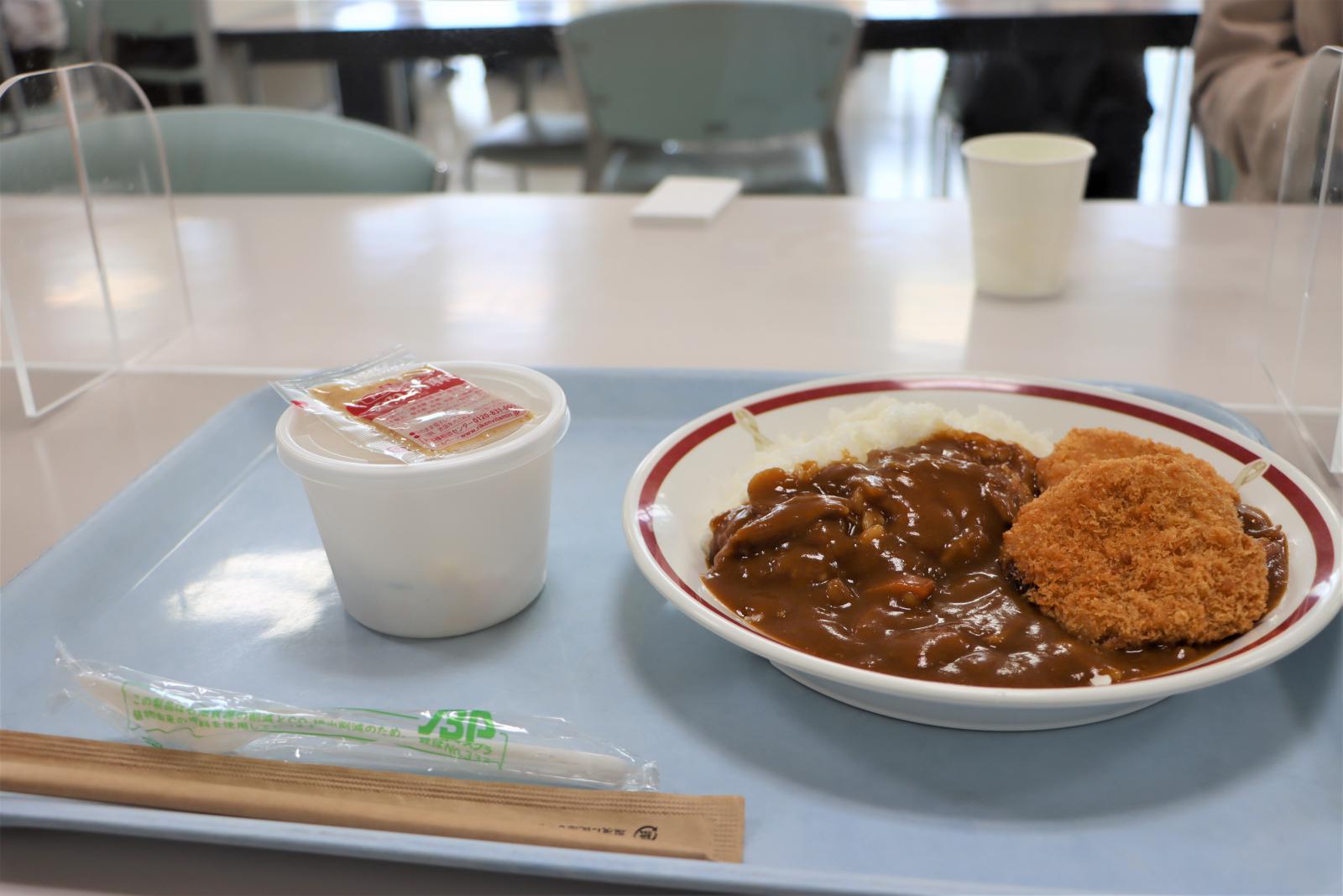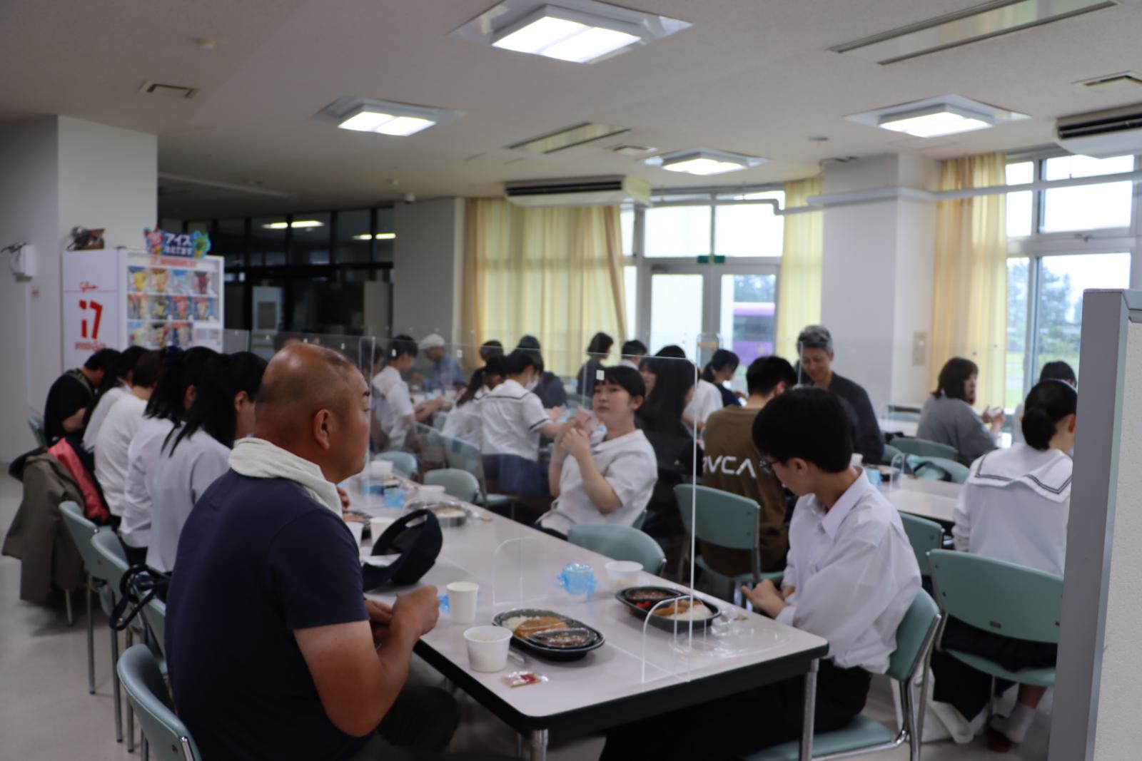 大潟キャンパス見学バスツアーも開催し、35名がバスに乗車し、アグリビジネス学科へと向かいました。大潟キャンパスには学生寮を完備しており、現在216名の学生がここで生活しています。寮での生活スペースや大浴場も見学し、昼食は食堂でカツカレーを召し上がっていただきました。