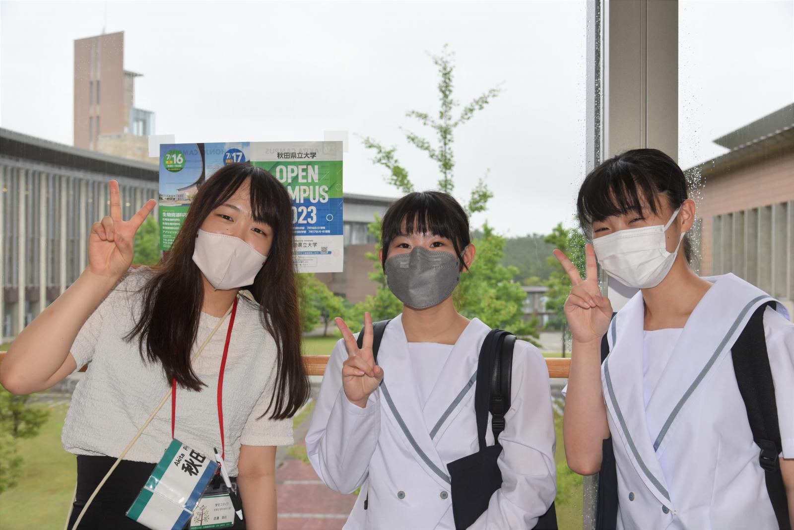 令和5年7月16日(日)生物資源科学部、7月17日(月・祝)システム科学技術学部のオープンキャンパスは、雨脚も弱まるとの見通しであったため、予定通りオープンキャンパスを開催しました。開催にあたっては、前日の予想外の豪雨で秋田市内でも至る所での浸水等の被害もあり、参加予定の皆さまには安全の確保が最優先であることを、ホームページ、Twitter等で呼びかけ、安全にお越しいただける方々のみを対象としての実施となりました。