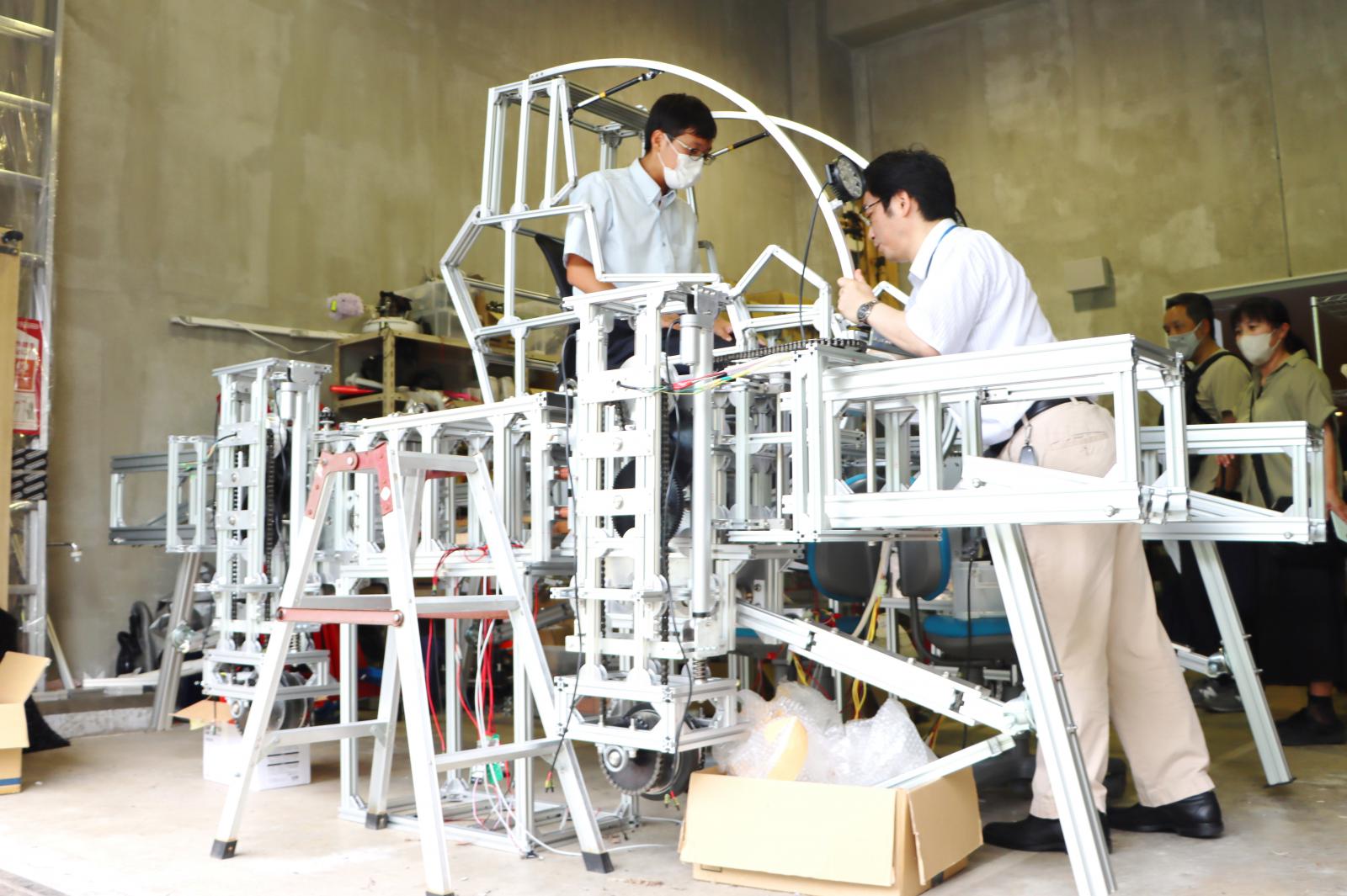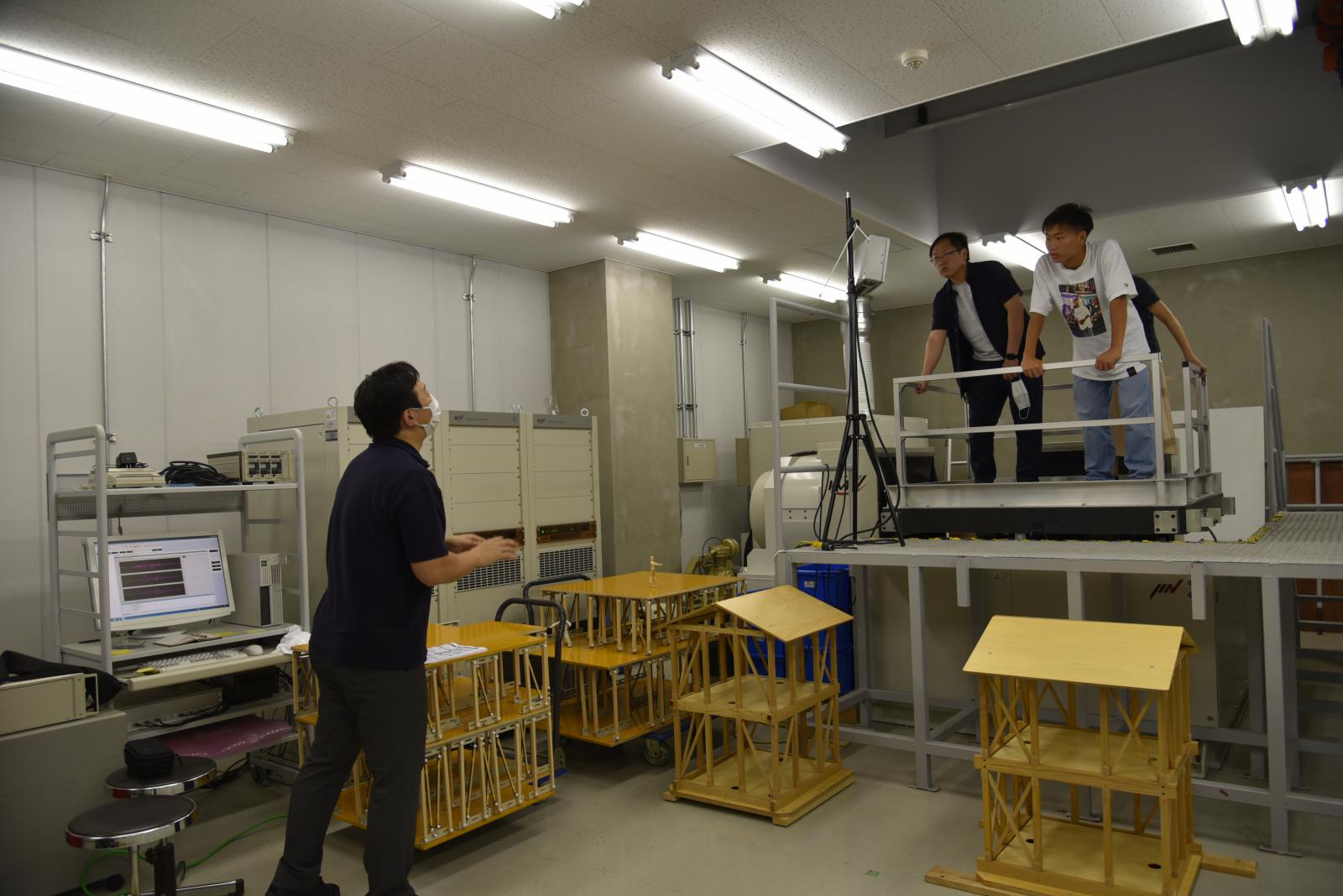 本荘キャンパスには、研究室がある学部棟・大学院棟のほか特別実験棟・創造工房棟という施設があります。ここには、研究室には収まらない大型の実験設備があり、今回は建築環境システム学科の模擬実験として振動台デモンストレーションやコンクリート破壊実験などを体験していただきました。