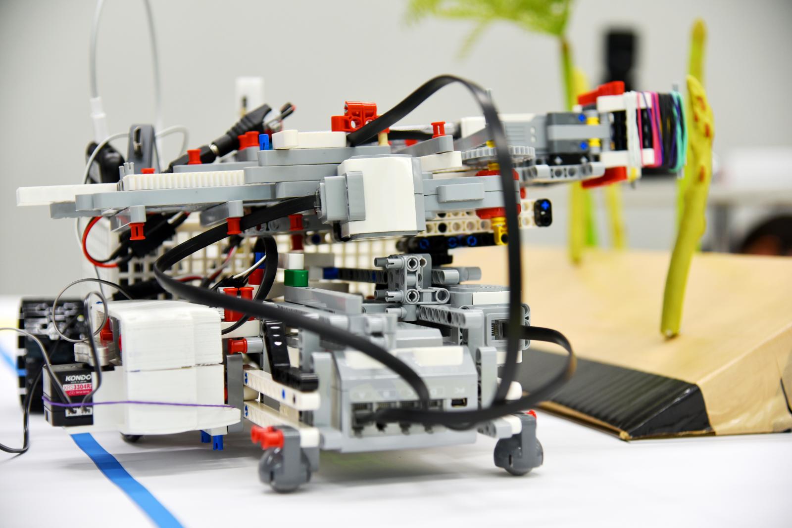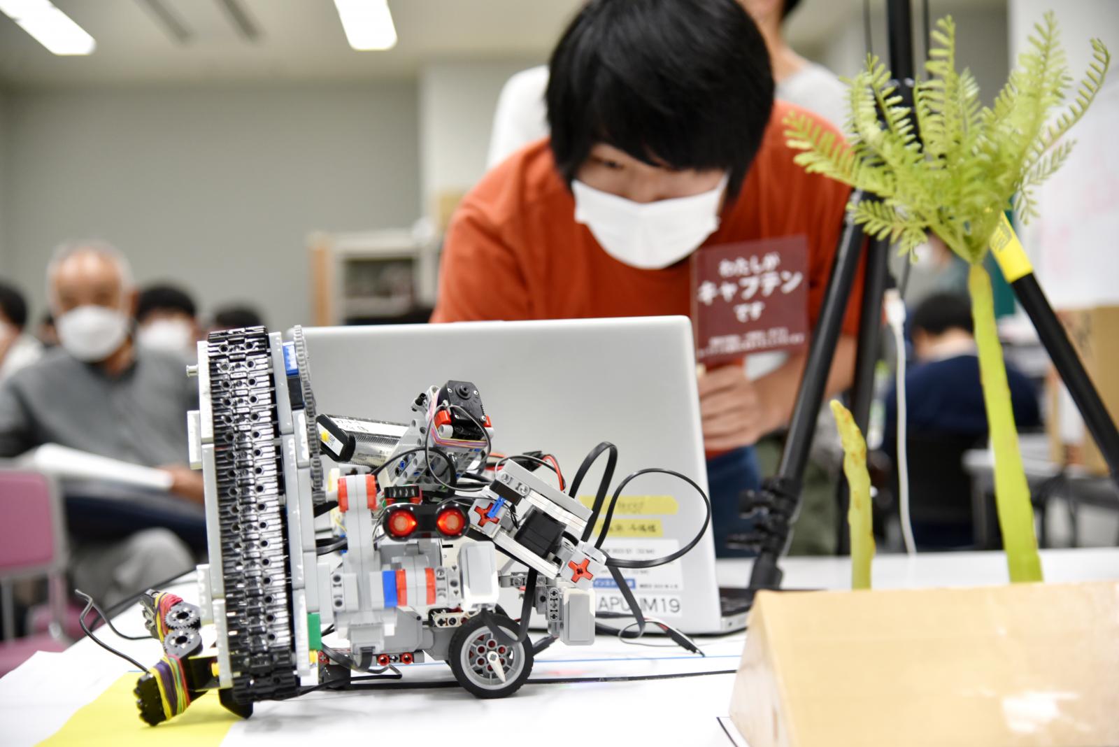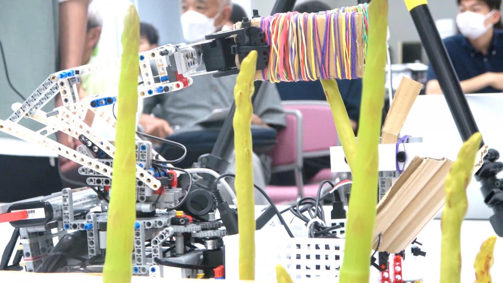 当日は、11班(各班5~6人)に分かれて、それぞれ製作したオリジナルの「アスパラガス自動収穫システム」を披露し、畑のアスパラガスを自動的に収穫し搬出エリアへと運ぶ動作を競い合いました。創意工夫を存分に盛り込んだロボットが次々登場し、白熱した真剣勝負が繰り広げられました。