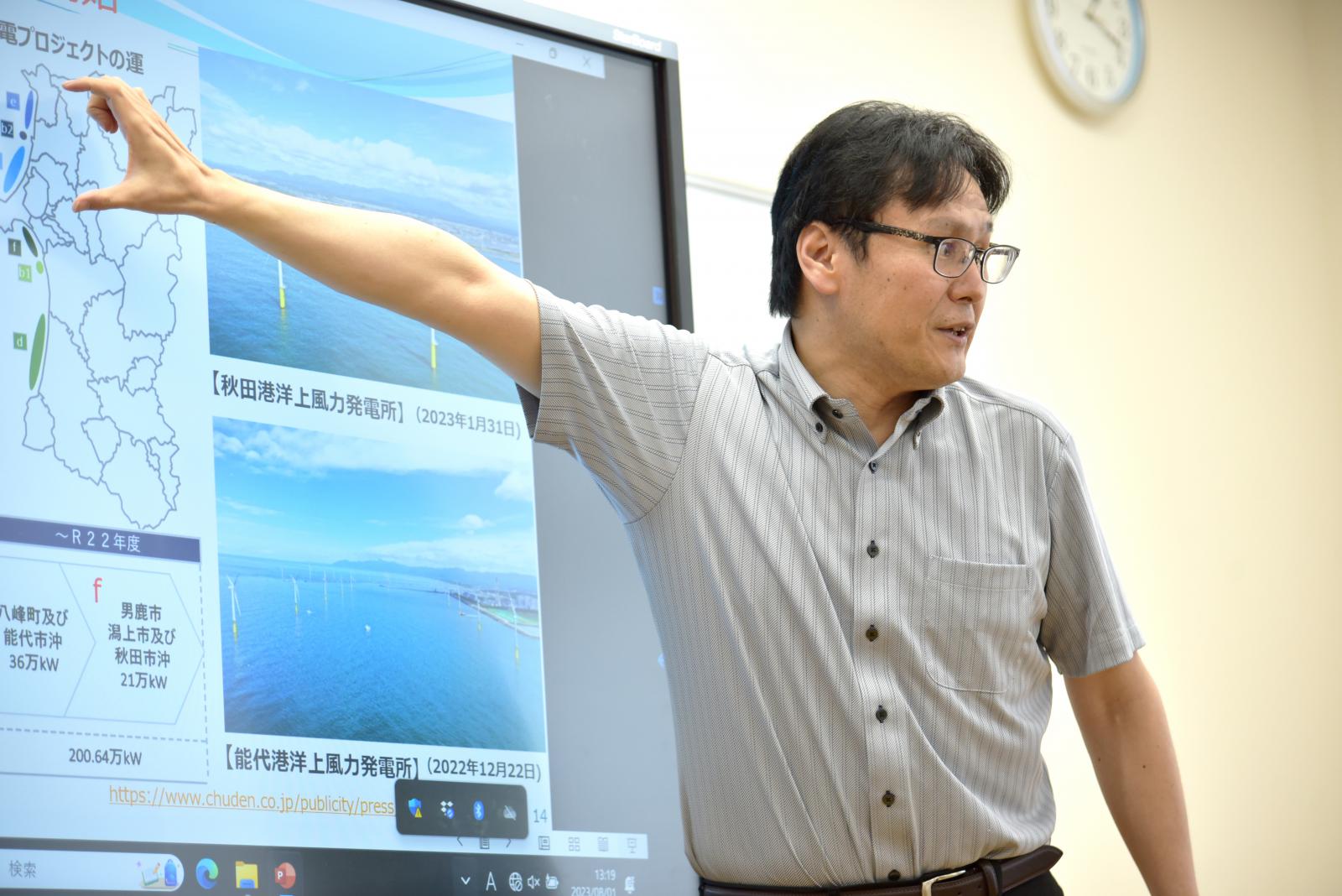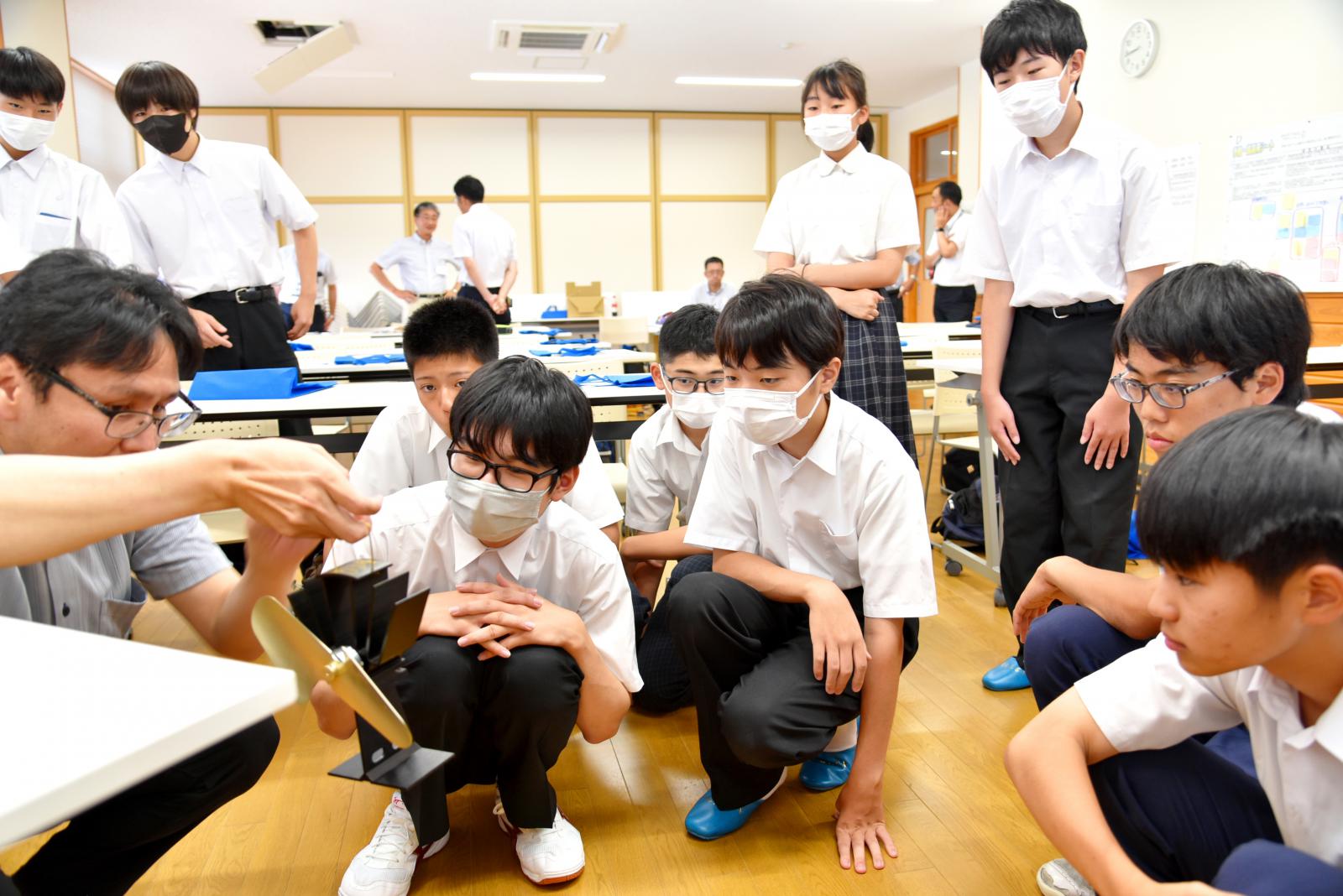 講師:知能メカトロニクス学科 長南 安紀 助教[専門:電子・電気材料工学]自然の力を利用して電気エネルギーを作り出す環境発電が様々な場所で利用されていますが、特に秋田県は、風力発電と地熱発電を主力に再生可能エネルギーの導入を積極的に進めている現状等を理解しました。また、直流電流により冷却・加熱を自由に行える「ペルチェ素子」という熱電変換素子を用いて、熱エネルギーを電気エネルギーに変換する「熱電発電」も体験。冷たい氷の上に「ペルチェ素子」を設置し手を押し当て、”温度差”によりで発電し小さい風車が回り始めた時は、大きな歓声が上がりました。